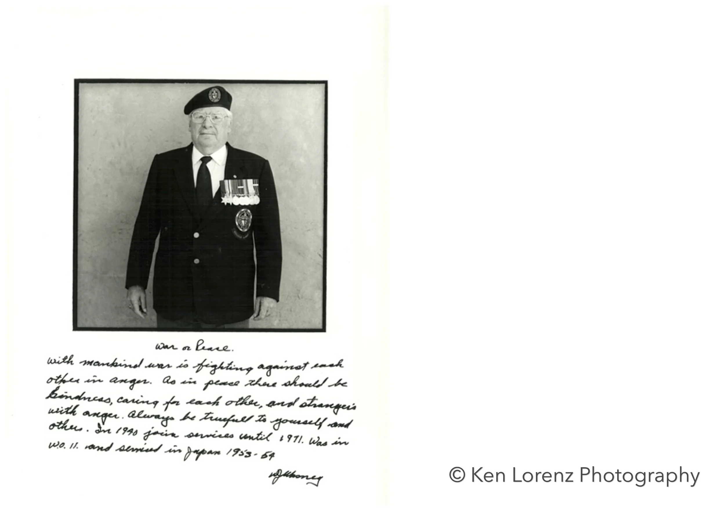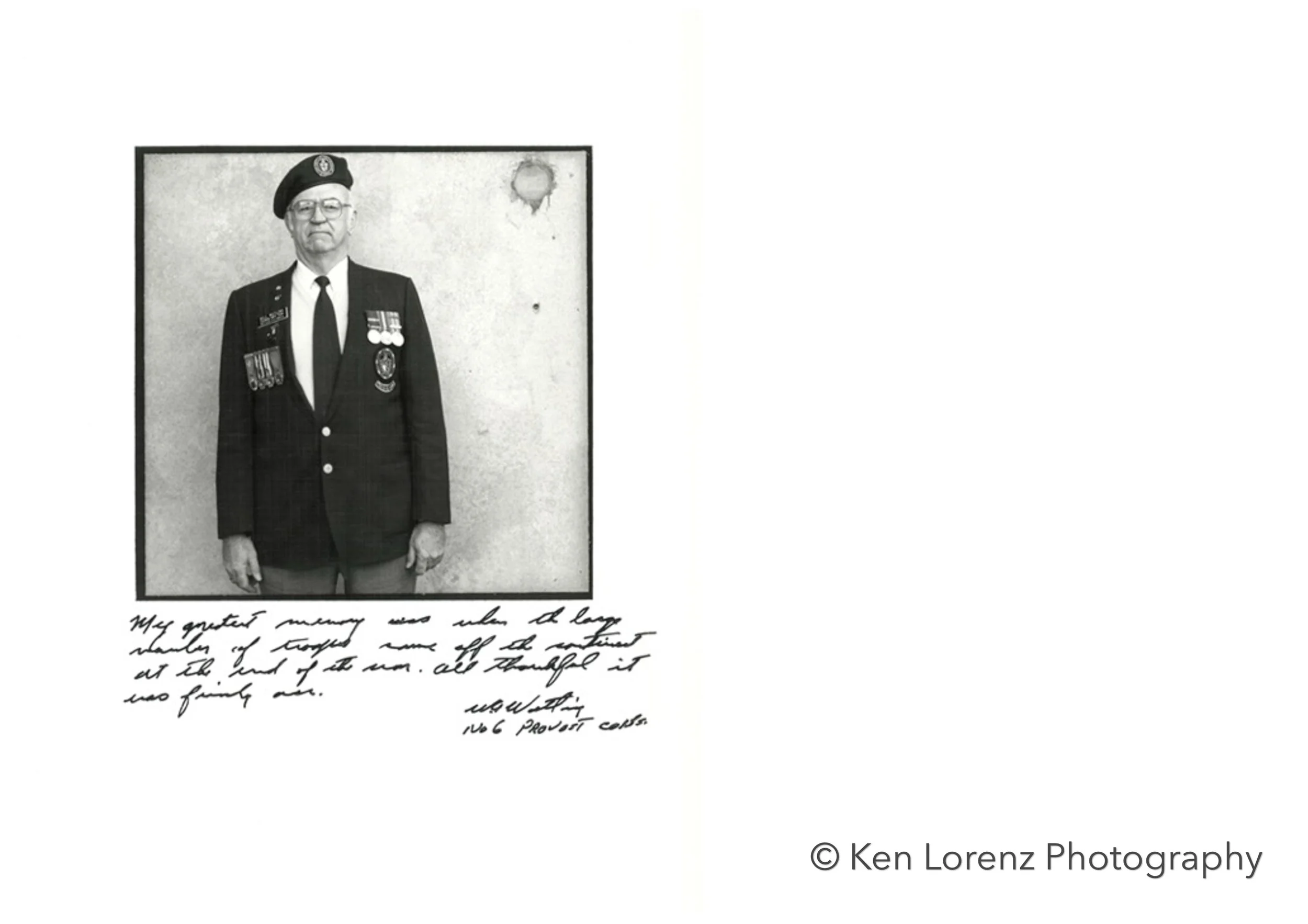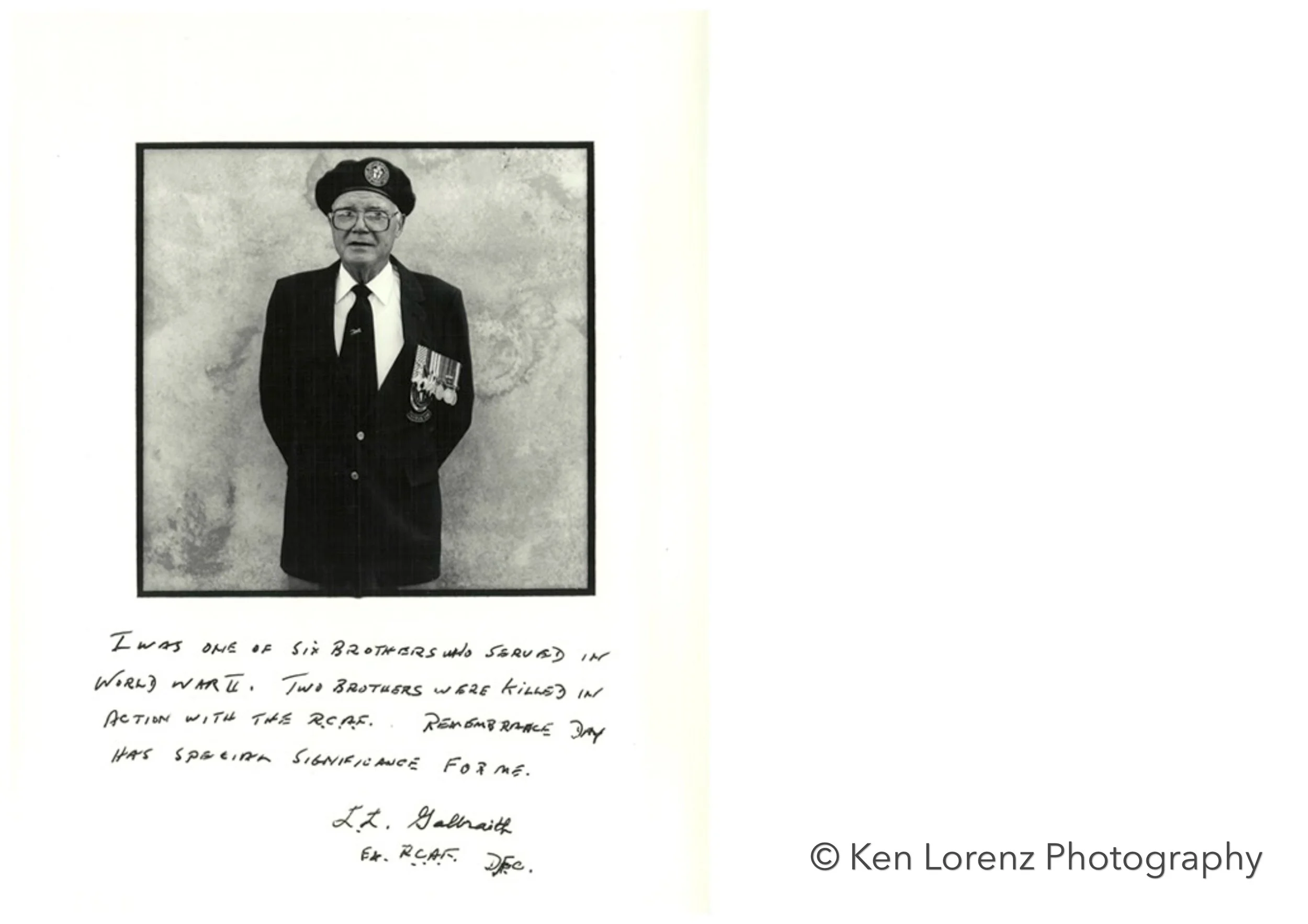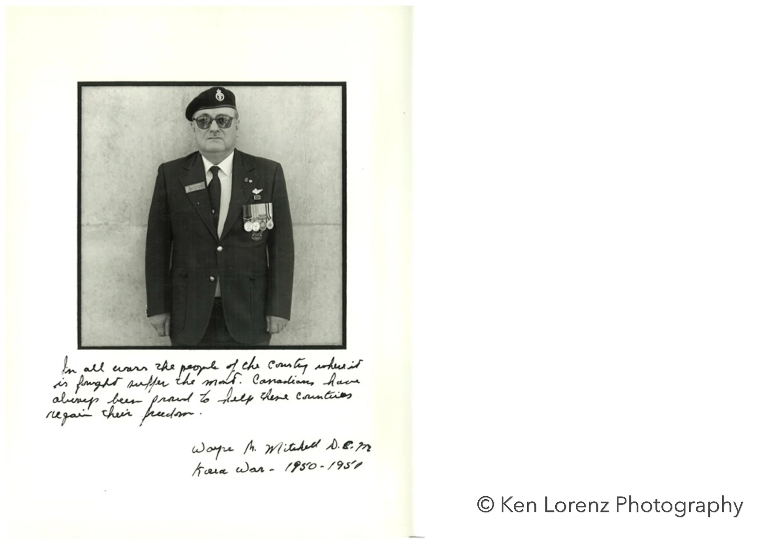 Most Canadians alive today are removed from war. Many of us are fortunate in that our experience of war is and has been indirect, either through historical study of past events or, perhaps at its closest approach, through the reporting in newspapers and television of current but distant events. However, our distance from war is more than spatial or temporal; it is also emotional, and even moral, and this kind of non-physical distance is potentially dangerous. What we fail to derive from history, or even the barrage of exciting but fleeting images of televised news coverage, is the urgency of conflict. There are two, sometimes opposing aspects to this sense of urgency. The first is somewhat abstract and removed from the tumult of day to day living, but it is evident when war presses upon a nation: we feel that our way of life, the democratic and humanistic ideals by which we live, and even the lives of our nation’s people are somehow imperiled; and so we must fight. This was certainly true of the great wars of this century in which Canada participated. There is also a more personal sense of urgency to war, one that is most often felt on the battlefield. Especially true today, this feeling of personal mortal danger is just as real to individual civilians as it is to those doing the actual fighting, but nothing can quite compare to the immediacy of the soldier’s gripping dread as he/she waits to confront “the enemy”. In the heat of battle, thoughts of noble causes and abstract concepts are short-lived when they are those of men who must face fear and death. What cannot be ephemeral, however, is the soldier’s courage, since it is only with courage that the first, abstract sense of urgency can overcome the more immediate second, and it is only with courage that the soldier upholds the principles for which he fights while at the same time fighting. From a distance, it is easy, though still necessary, to question the motivations and choices of nations and individuals waging war, but it is not easy to grasp the urgency that compels the emotional and moral decisions to kill and to be killed. There is today a new urgency surrounding the survivors of Canada’s war experience. Although every November 11 th we pause to remember those who fought for our nation, and especially those who made their ultimate sacrifice, The Canadian war veterans together remain a vigorous institution in this country., and are a daily testimony to important parts of our history. But as Canada enjoys a lasting peace, it is in danger of losing to time this testimony to events that surely helped found that peace. “40 Memoirs” is in part a response to this new urgency, made all the more immediate by the passing of several veterans before their written comments could be etched below their photographs. It is a rare visual document, not of war, but of these one-time warriors. They are the only group of men and women in our society for whom the experience of war is vividly relived in memories, the only people who can communicate from first-hand knowledge its urgency, its terrible impact on human lives, and why it should never come to be experienced by Canadians again; moreover, they are the only ones who can communicate why it was at one time necessary to fight in order to ultimately sustain life. But the prints, composed of a photograph of each veteran in a stylized, strong eye contact pose coupled with a statement of their wartime ordeal in raw, black ink, do more than document an institution: they capture a little of the essence of each man and woman photographed and force the viewer to confront each veteran on a personal level. They declare such a stark and unshielded honesty that when we look a veteran directly in the eyes, as we must when viewing the photographs, we too are compelled to a certain honesty. The prints speak to us and we respond to the voice, and to the face that is behind it, and to the message that the voice and the face convey. The message might be a recounting of a particular incident in the war, or it might be a simple affirmation of the favourite “war is hell” ! If the meaning of these words has been tarnished over time with usage, it is the eyes of the veteran above the words that tell of their true significance. It is the eyes, and the voice, to which we must respond with an honesty that cuts across our political persuasion, and our support for, or enmity towards, or indifference to military institutions and policies. In the end, we can only respond to the individual, and to his courage.