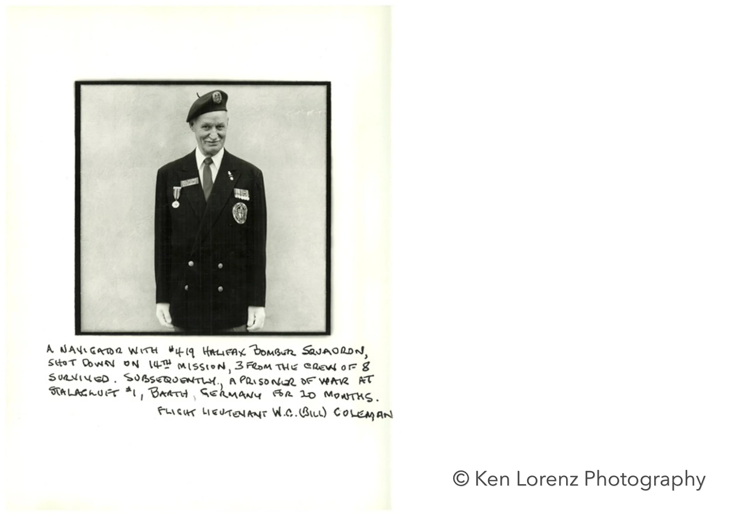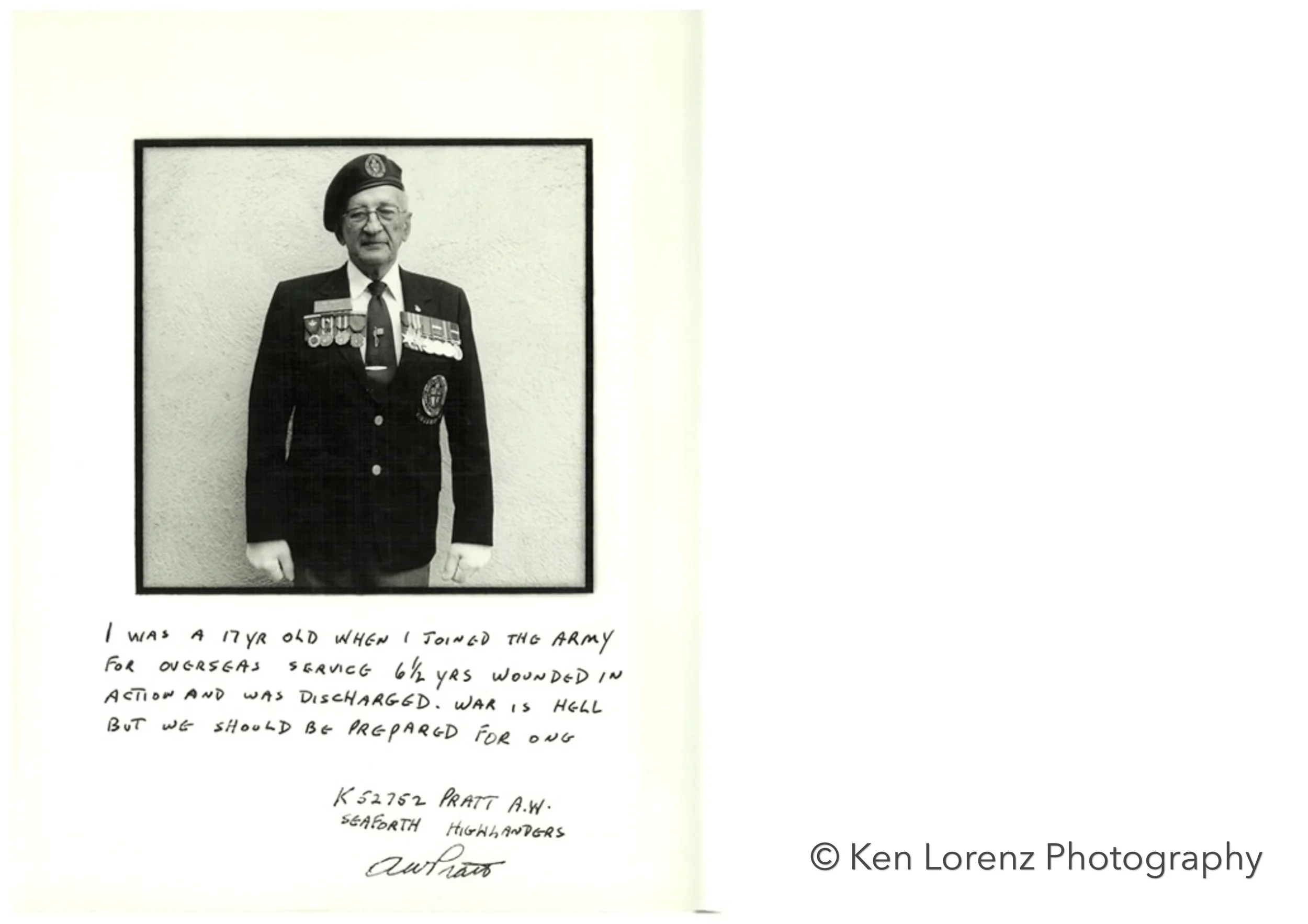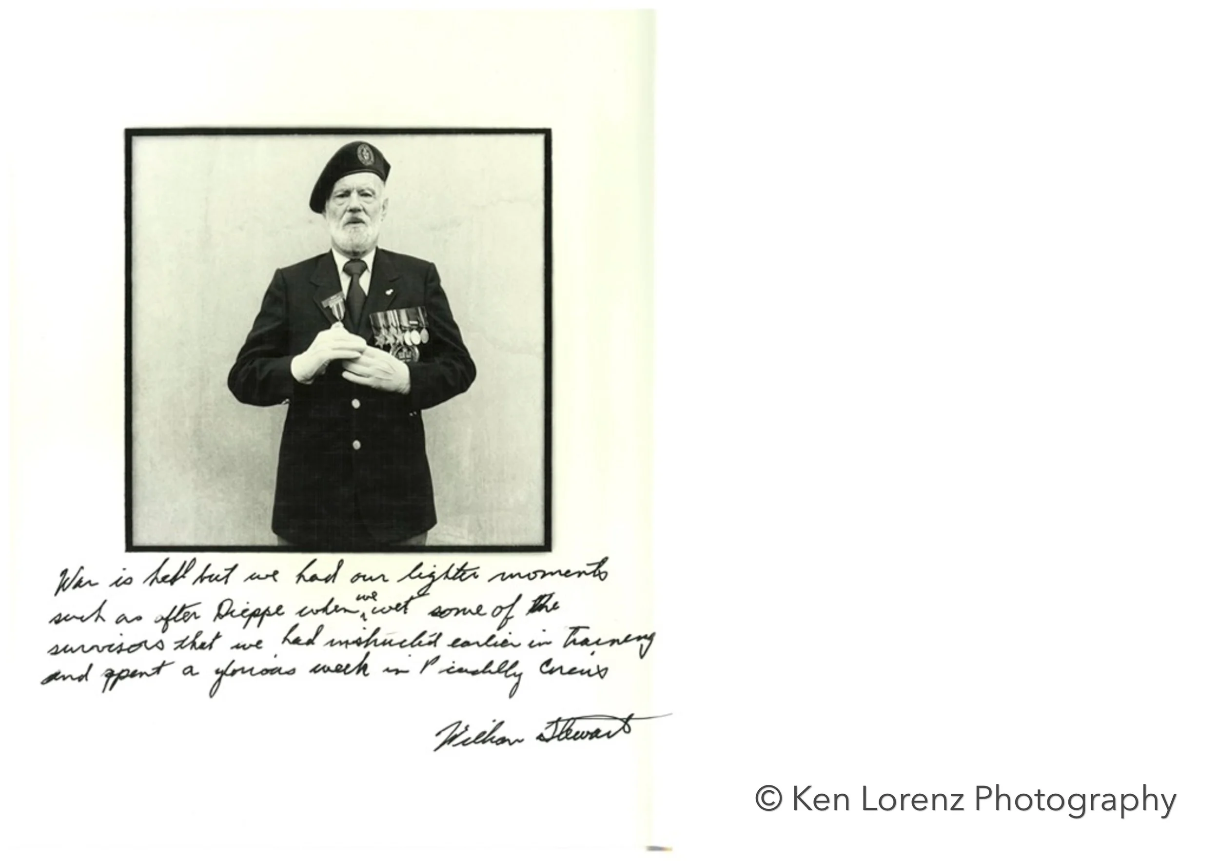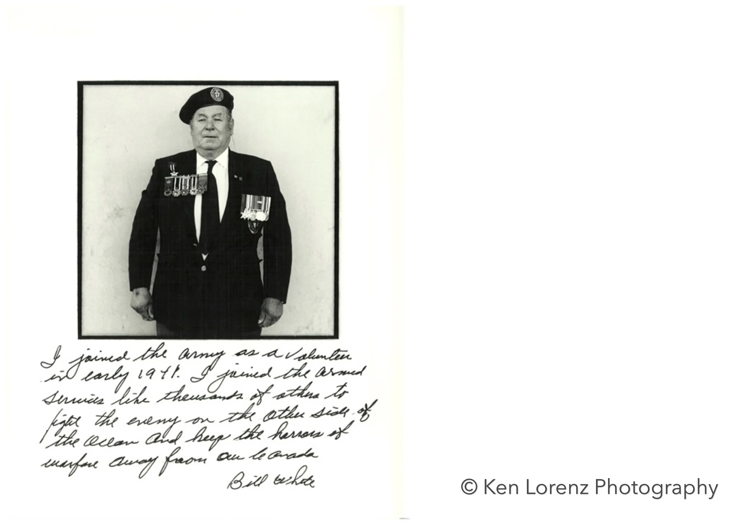 Most Canadians alive today are removed from war. Many of us are fortunate in that our experience of war is and has been indirect, either through historical study of past events or, perhaps at its closest approach, through the reporting in newspapers and television of current but distant events. However, our distance from war is more than spatial or temporal; it is also emotional, and even moral, and this kind of non-physical distance is potentially dangerous. What we fail to derive from history, or even the barrage of exciting but fleeting images of televised news coverage, is the urgency of conflict. There are two, sometimes opposing aspects to this sense of urgency. The first is somewhat abstract and removed from the tumult of day to day living, but it is evident when war presses upon a nation: we feel that our way of life, the democratic and humanistic ideals by which we live, and even the lives of our nation’s people are somehow imperiled; and so we must fight. This was certainly true of the great wars of this century in which Canada participated. There is also a more personal sense of urgency to war, one that is most often felt on the battlefield. Especially true today, this feeling of personal mortal danger is just as real to individual civilians as it is to those doing the actual fighting, but nothing can quite compare to the immediacy of the soldier’s gripping dread as he/she waits to confront “the enemy”. In the heat of battle, thoughts of noble causes and abstract concepts are short-lived when they are those of men who must face fear and death. What cannot be ephemeral, however, is the soldier’s courage, since it is only with courage that the first, abstract sense of urgency can overcome the more immediate second, and it is only with courage that the soldier upholds the principles for which he fights while at the same time fighting. From a distance, it is easy, though still necessary, to question the motivations and choices of nations and individuals waging war, but it is not easy to grasp the urgency that compels the emotional and moral decisions to kill and to be killed. There is today a new urgency surrounding the survivors of Canada’s war experience. Although every November 11 th we pause to remember those who fought for our nation, and especially those who made their ultimate sacrifice, The Canadian war veterans together remain a vigorous institution in this country., and are a daily testimony to important parts of our history. But as Canada enjoys a lasting peace, it is in danger of losing to time this testimony to events that surely helped found that peace. “40 Memoirs” is in part a response to this new urgency, made all the more immediate by the passing of several veterans before their written comments could be etched below their photographs. It is a rare visual document, not of war, but of these one-time warriors. They are the only group of men and women in our society for whom the experience of war is vividly relived in memories, the only people who can communicate from first-hand knowledge its urgency, its terrible impact on human lives, and why it should never come to be experienced by Canadians again; moreover, they are the only ones who can communicate why it was at one time necessary to fight in order to ultimately sustain life. But the prints, composed of a photograph of each veteran in a stylized, strong eye contact pose coupled with a statement of their wartime ordeal in raw, black ink, do more than document an institution: they capture a little of the essence of each man and woman photographed and force the viewer to confront each veteran on a personal level. They declare such a stark and unshielded honesty that when we look a veteran directly in the eyes, as we must when viewing the photographs, we too are compelled to a certain honesty. The prints speak to us and we respond to the voice, and to the face that is behind it, and to the message that the voice and the face convey. The message might be a recounting of a particular incident in the war, or it might be a simple affirmation of the favourite “war is hell” ! If the meaning of these words has been tarnished over time with usage, it is the eyes of the veteran above the words that tell of their true significance. It is the eyes, and the voice, to which we must respond with an honesty that cuts across our political persuasion, and our support for, or enmity towards, or indifference to military institutions and policies. In the end, we can only respond to the individual, and to his courage.