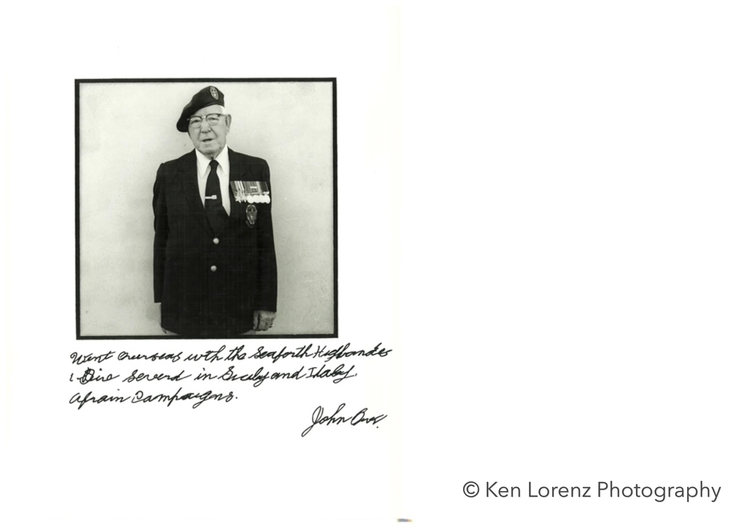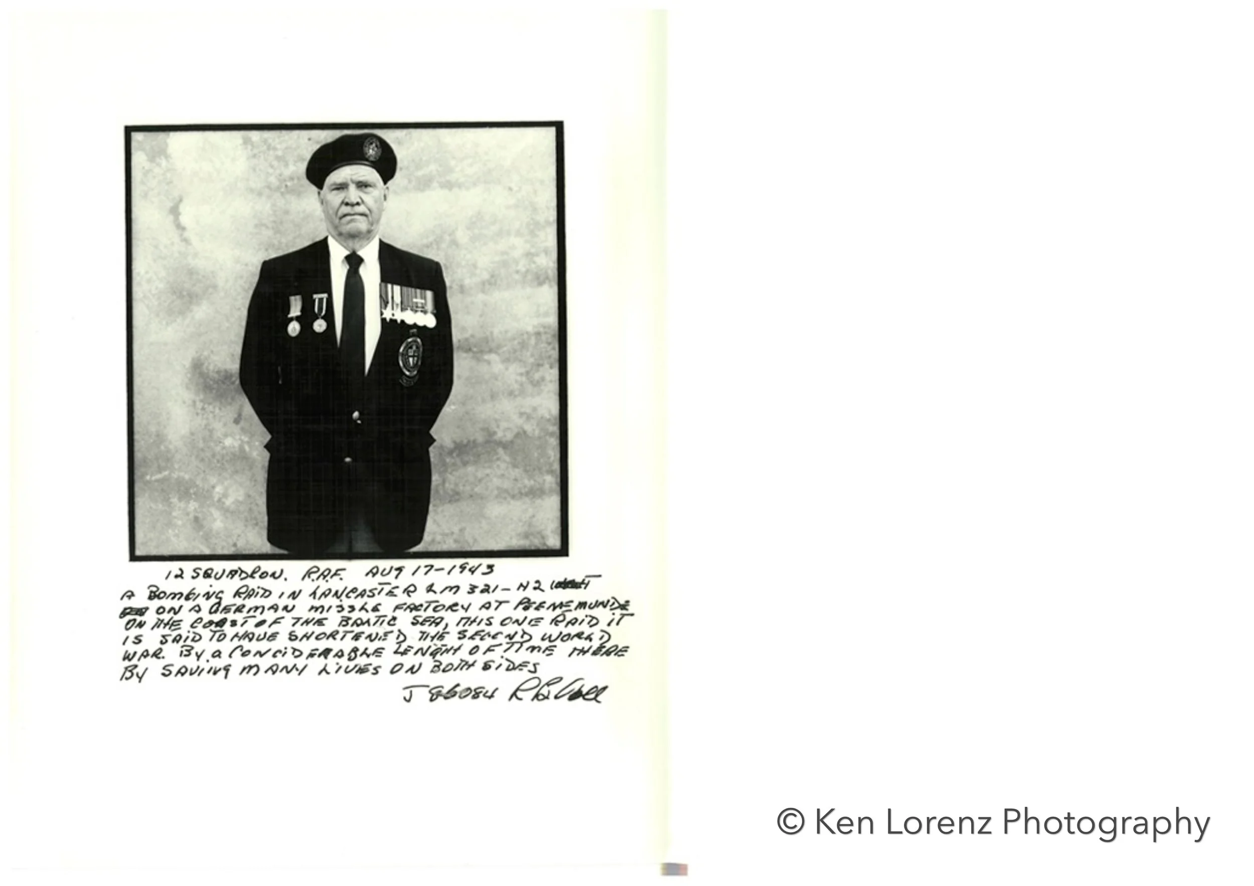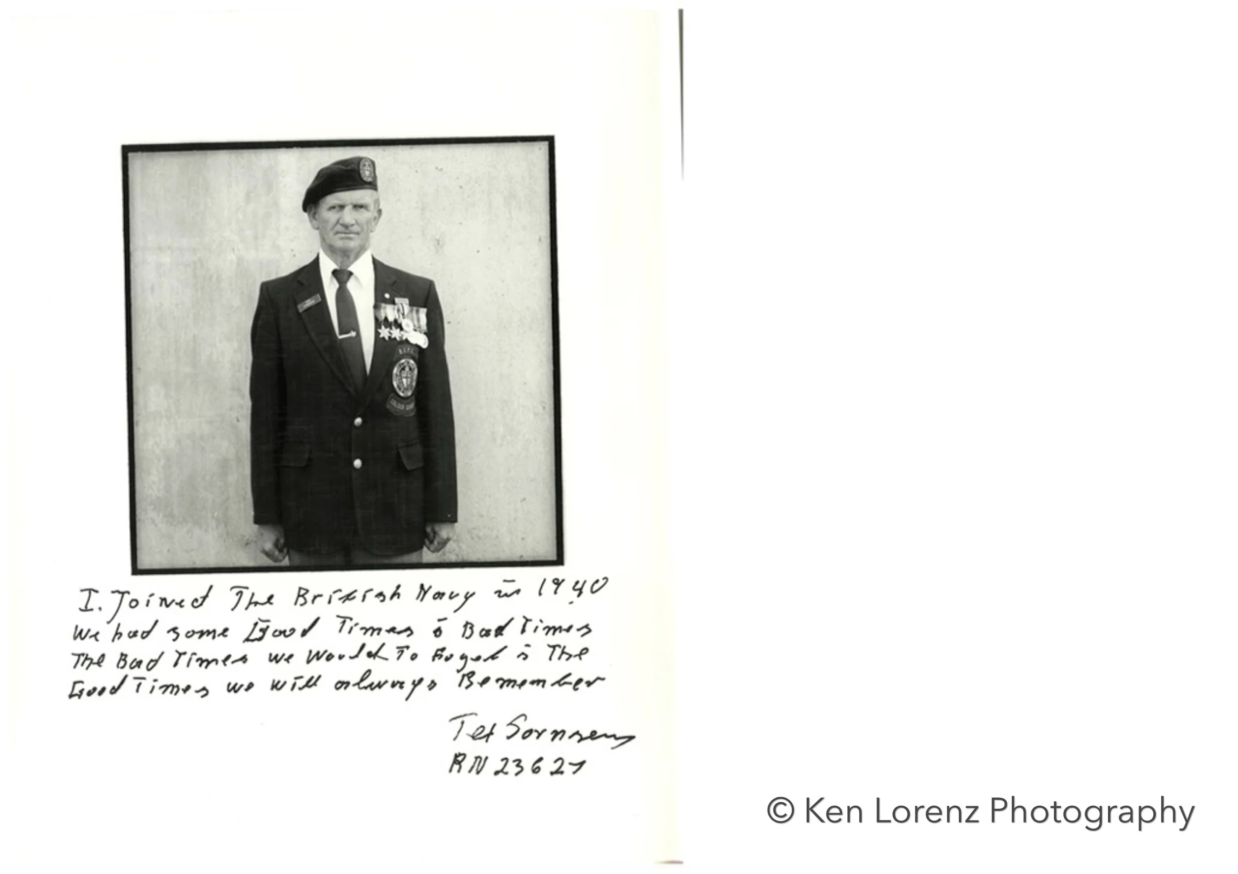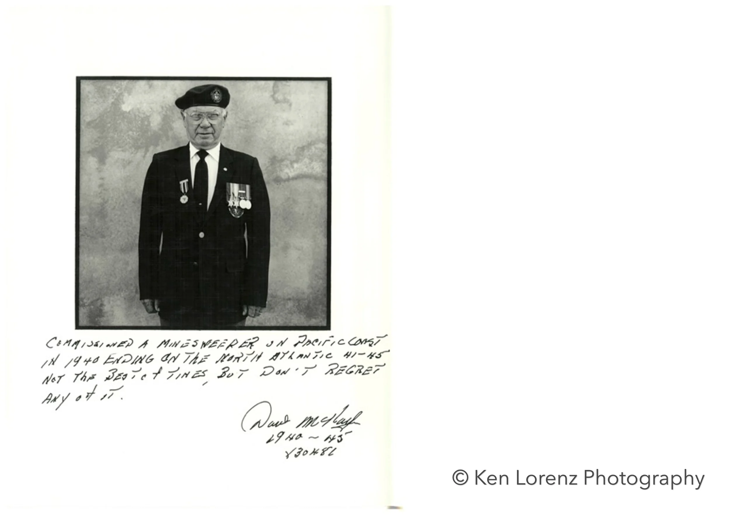 Most Canadians alive today are removed from war. Many of us are fortunate in that our experience of war is and has been indirect, either through historical study of past events or, perhaps at its closest approach, through the reporting in newspapers and television of current but distant events. However, our distance from war is more than spatial or temporal; it is also emotional, and even moral, and this kind of non-physical distance is potentially dangerous. What we fail to derive from history, or even the barrage of exciting but fleeting images of televised news coverage, is the urgency of conflict. There are two, sometimes opposing aspects to this sense of urgency. The first is somewhat abstract and removed from the tumult of day to day living, but it is evident when war presses upon a nation: we feel that our way of life, the democratic and humanistic ideals by which we live, and even the lives of our nation’s people are somehow imperiled; and so we must fight. This was certainly true of the great wars of this century in which Canada participated. There is also a more personal sense of urgency to war, one that is most often felt on the battlefield. Especially true today, this feeling of personal mortal danger is just as real to individual civilians as it is to those doing the actual fighting, but nothing can quite compare to the immediacy of the soldier’s gripping dread as he/she waits to confront “the enemy”. In the heat of battle, thoughts of noble causes and abstract concepts are short-lived when they are those of men who must face fear and death. What cannot be ephemeral, however, is the soldier’s courage, since it is only with courage that the first, abstract sense of urgency can overcome the more immediate second, and it is only with courage that the soldier upholds the principles for which he fights while at the same time fighting. From a distance, it is easy, though still necessary, to question the motivations and choices of nations and individuals waging war, but it is not easy to grasp the urgency that compels the emotional and moral decisions to kill and to be killed. There is today a new urgency surrounding the survivors of Canada’s war experience. Although every November 11 th we pause to remember those who fought for our nation, and especially those who made their ultimate sacrifice, The Canadian war veterans together remain a vigorous institution in this country., and are a daily testimony to important parts of our history. But as Canada enjoys a lasting peace, it is in danger of losing to time this testimony to events that surely helped found that peace. “40 Memoirs” is in part a response to this new urgency, made all the more immediate by the passing of several veterans before their written comments could be etched below their photographs. It is a rare visual document, not of war, but of these one-time warriors. They are the only group of men and women in our society for whom the experience of war is vividly relived in memories, the only people who can communicate from first-hand knowledge its urgency, its terrible impact on human lives, and why it should never come to be experienced by Canadians again; moreover, they are the only ones who can communicate why it was at one time necessary to fight in order to ultimately sustain life. But the prints, composed of a photograph of each veteran in a stylized, strong eye contact pose coupled with a statement of their wartime ordeal in raw, black ink, do more than document an institution: they capture a little of the essence of each man and woman photographed and force the viewer to confront each veteran on a personal level. They declare such a stark and unshielded honesty that when we look a veteran directly in the eyes, as we must when viewing the photographs, we too are compelled to a certain honesty. The prints speak to us and we respond to the voice, and to the face that is behind it, and to the message that the voice and the face convey. The message might be a recounting of a particular incident in the war, or it might be a simple affirmation of the favourite “war is hell” ! If the meaning of these words has been tarnished over time with usage, it is the eyes of the veteran above the words that tell of their true significance. It is the eyes, and the voice, to which we must respond with an honesty that cuts across our political persuasion, and our support for, or enmity towards, or indifference to military institutions and policies. In the end, we can only respond to the individual, and to his courage.