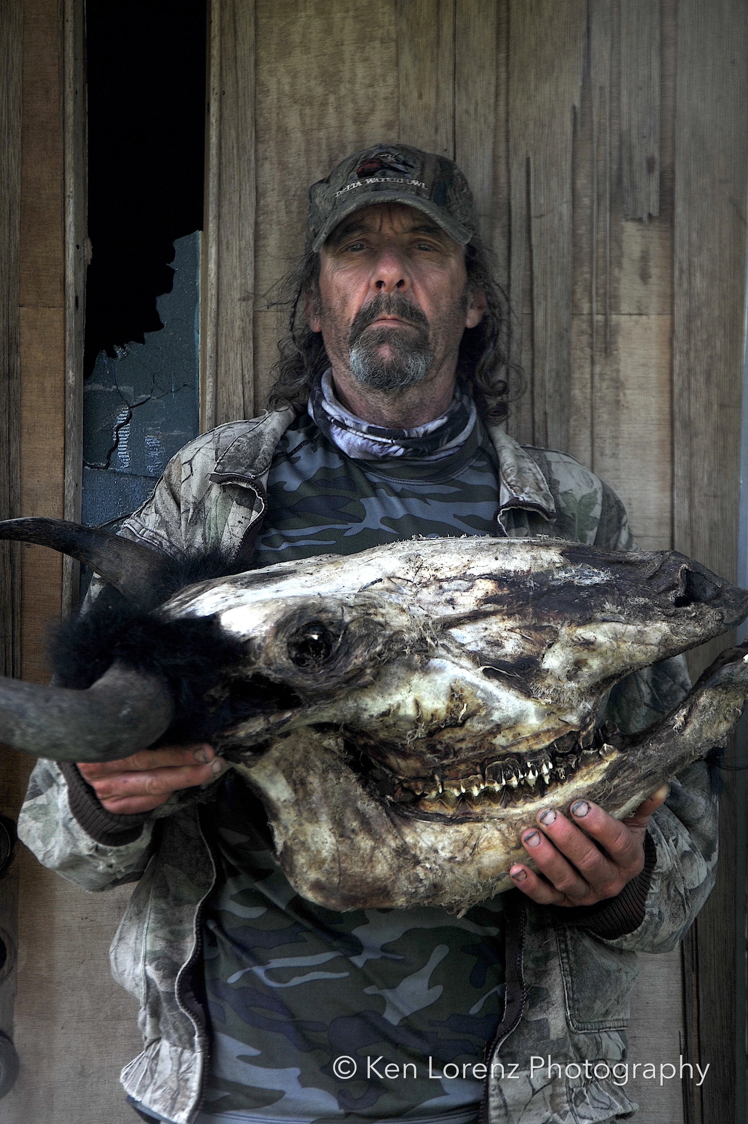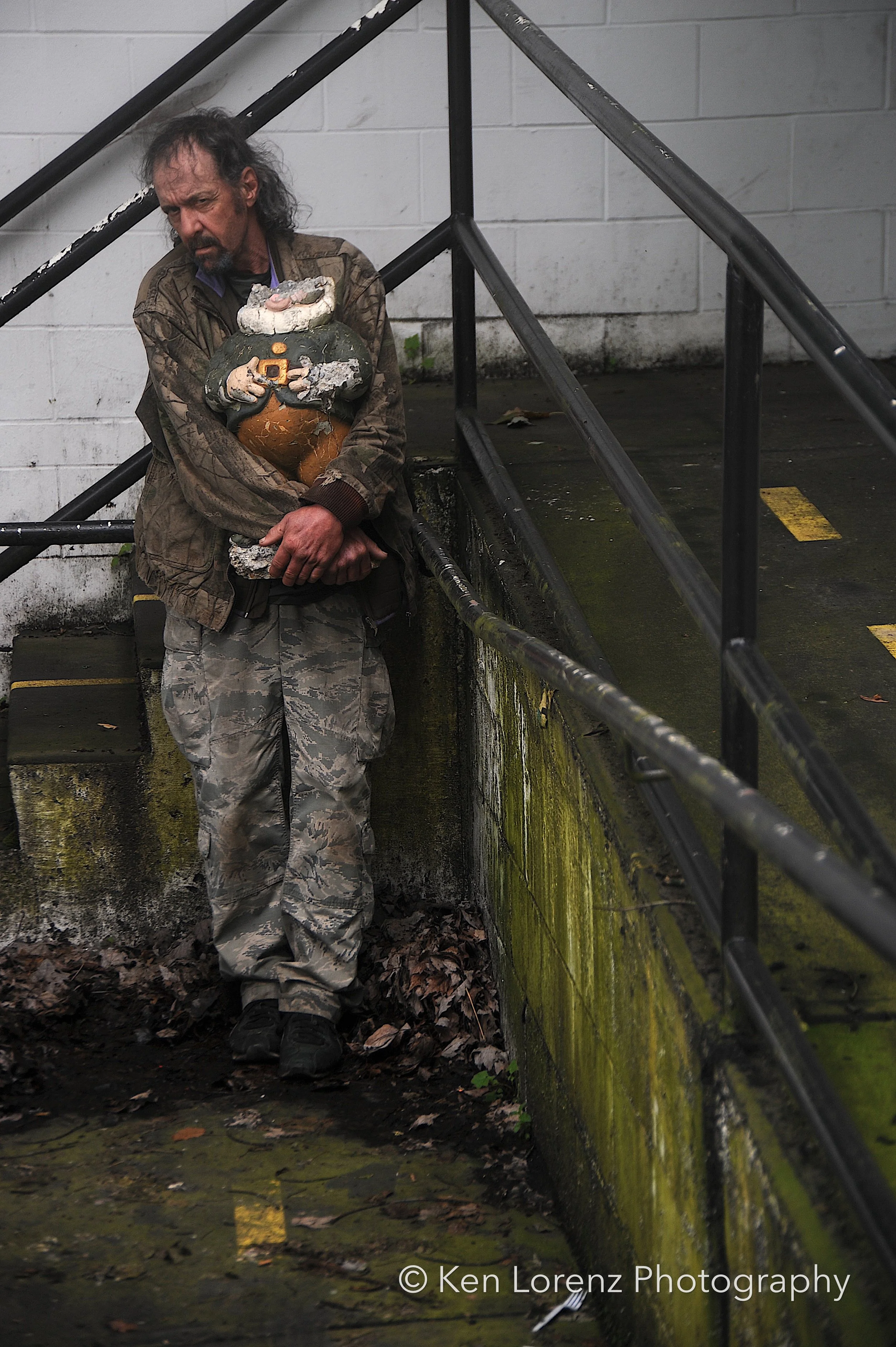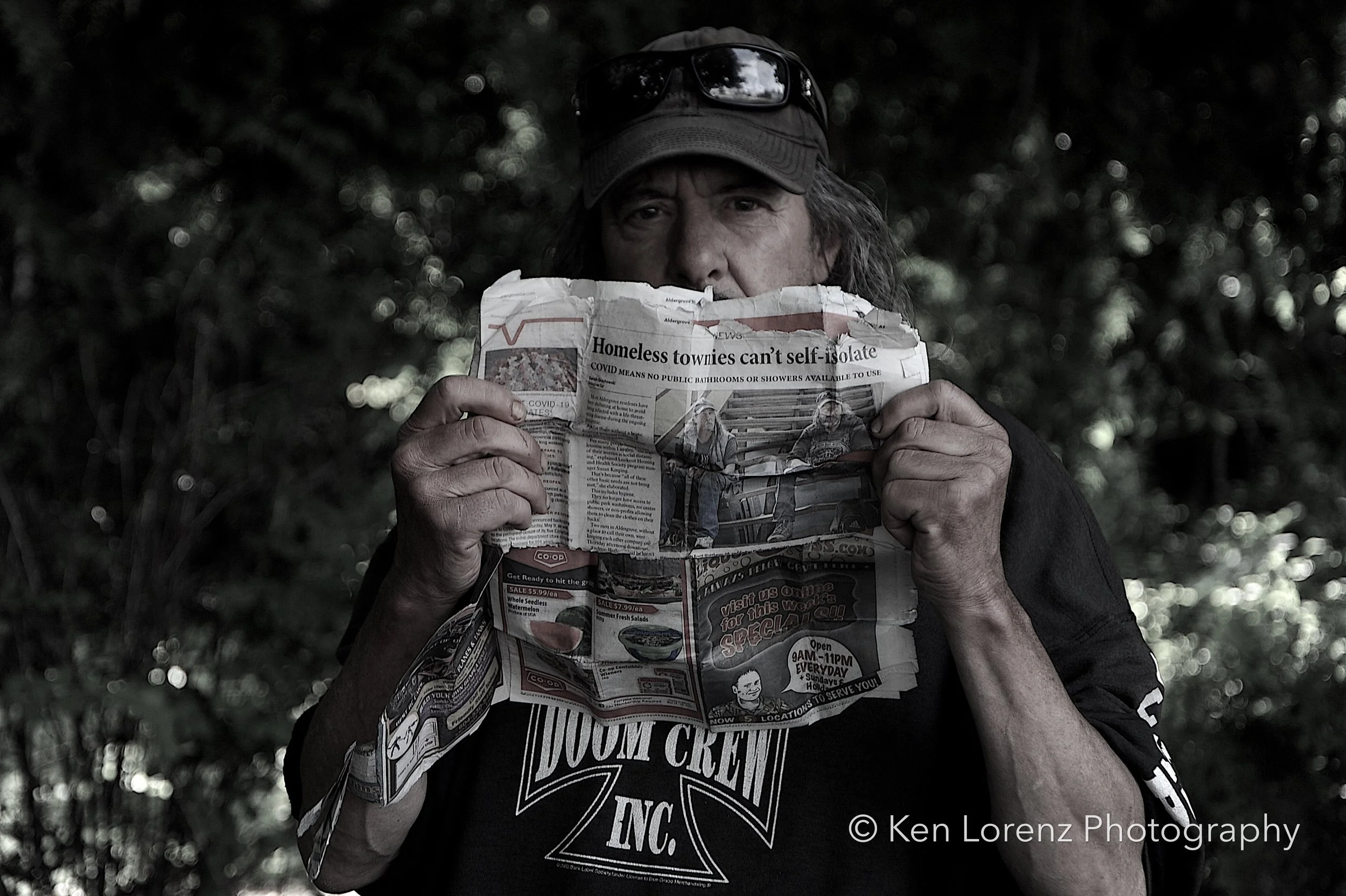 Andre was (and is) a homeless man of German descent whom I first met during the Covid pandemic. Along with him and about half a dozen of his street companions, I created a series of photographs entitled The Blue Mask Project. It was an anti-mask series, and to create a sense of irony I had them tear open a small section of a surgical mask so that a cigarette could pass through and into the subject’s mouth.