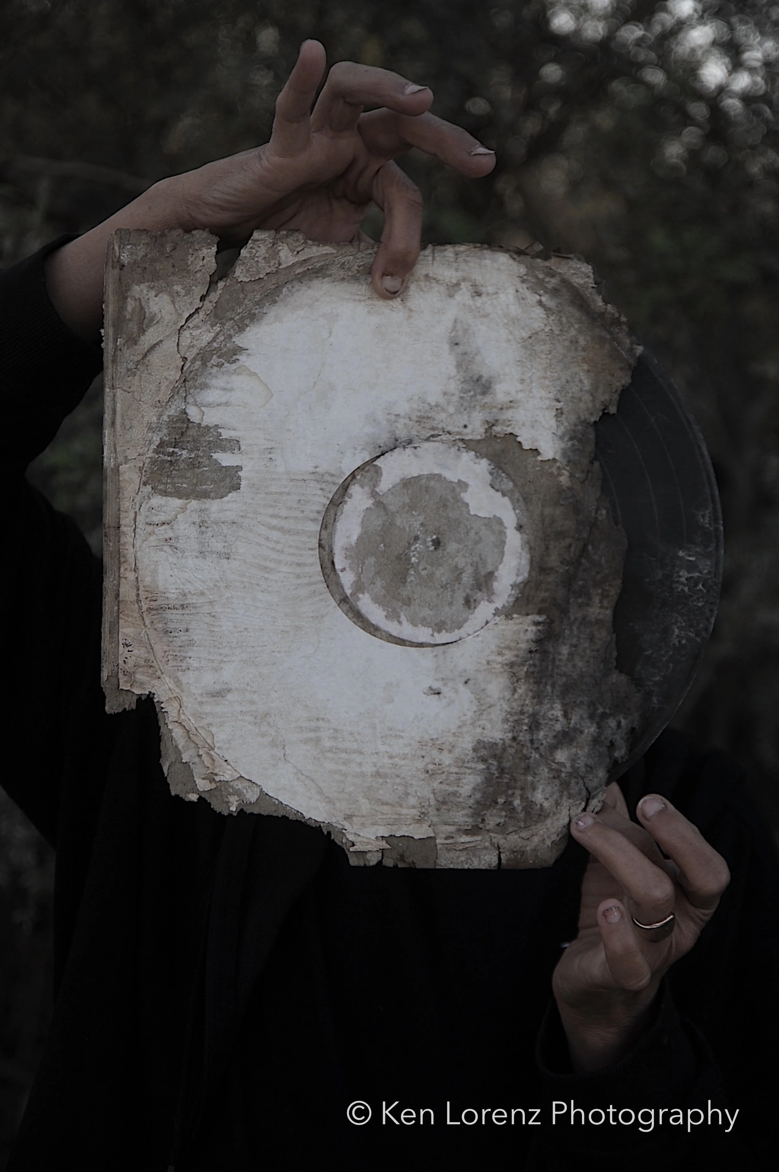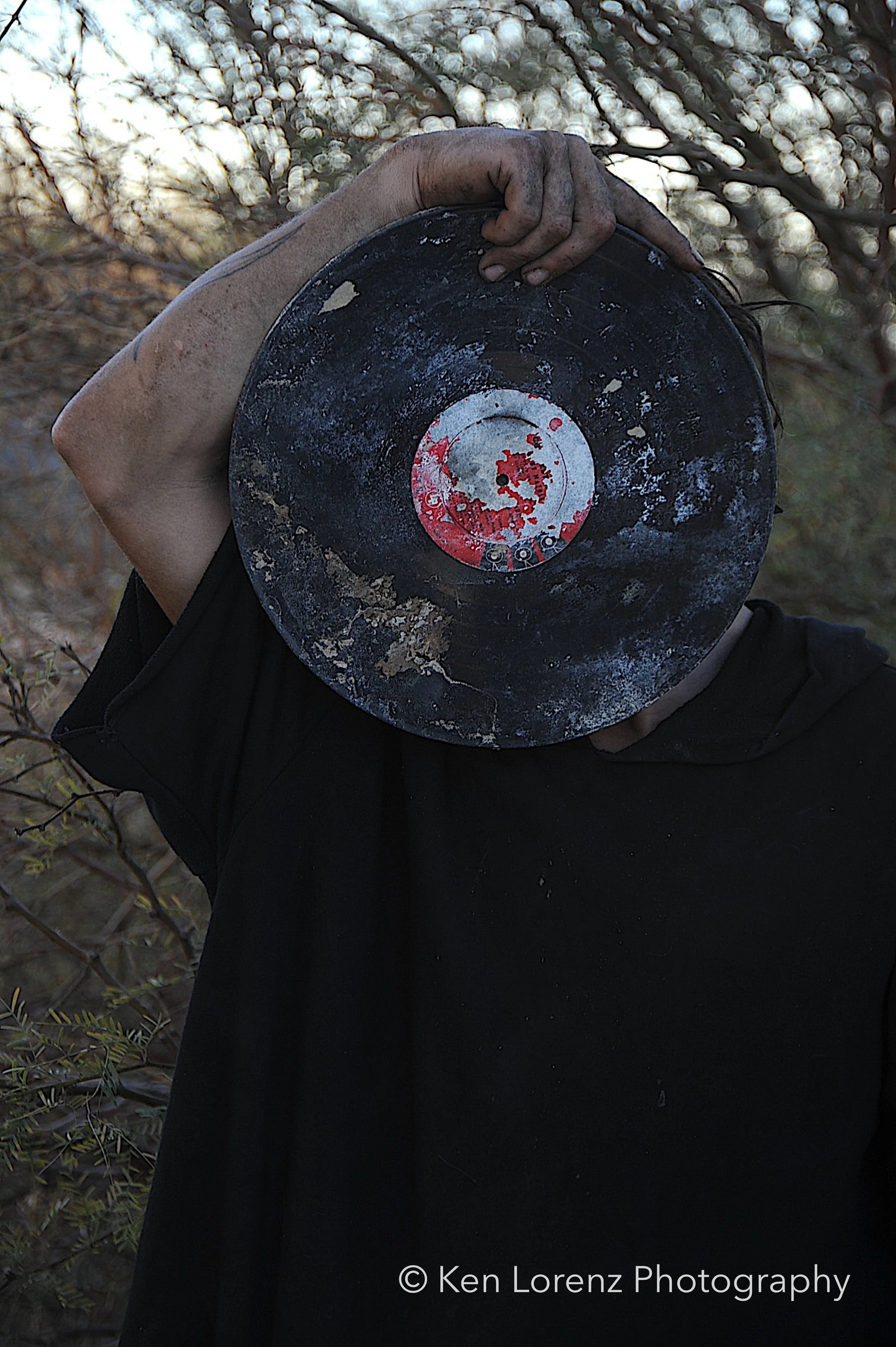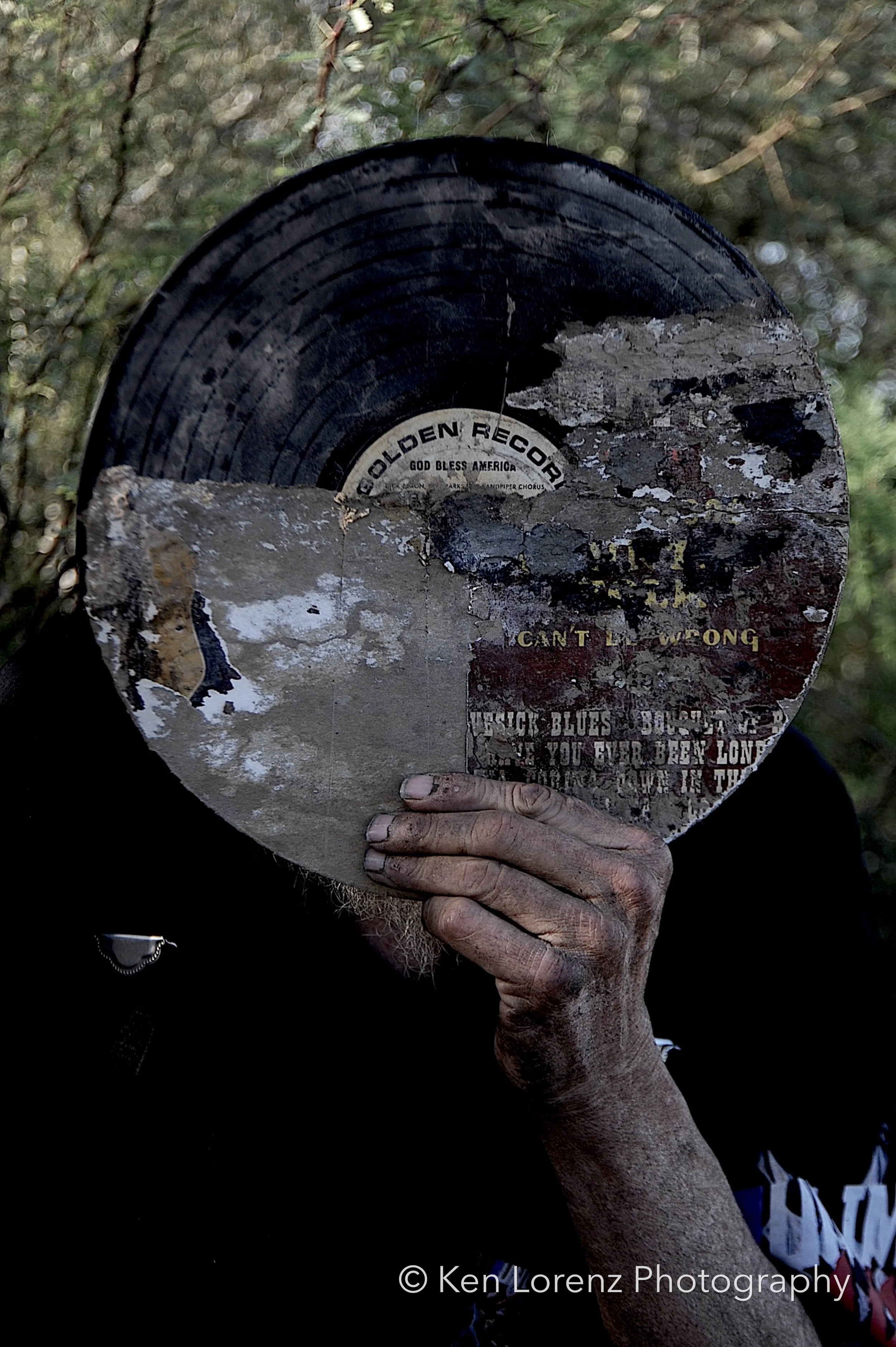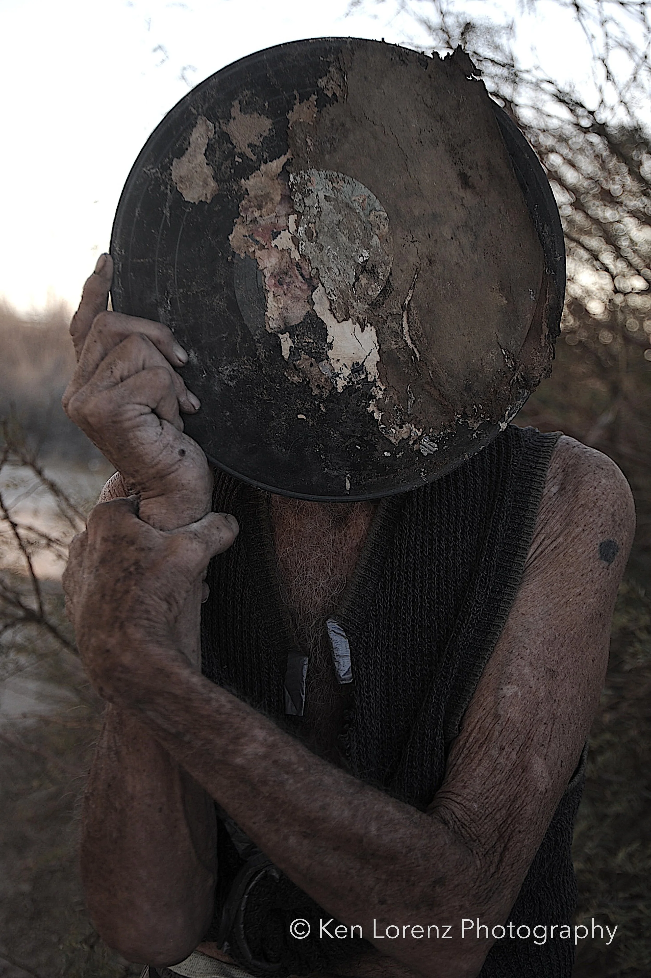 The records and their sleeves bore the marks of their environment: torn and fragmented covers, pigments drained by the desert sun, labels discolored and barely legible, grooves scarred by wind-driven sand and encroaching vegetation. These surfaces, once designed to preserve and transmit sound, now carry the visible inscription of time and entropy. In the work, these distressed LPs are reanimated as masks, worn by the “slabbers”—residents of Slab City who embody the improvisational, transient spirit of the community. Their presence situates the found objects within a living context, allowing the photographs to oscillate between documentation, portraiture, and metaphor.