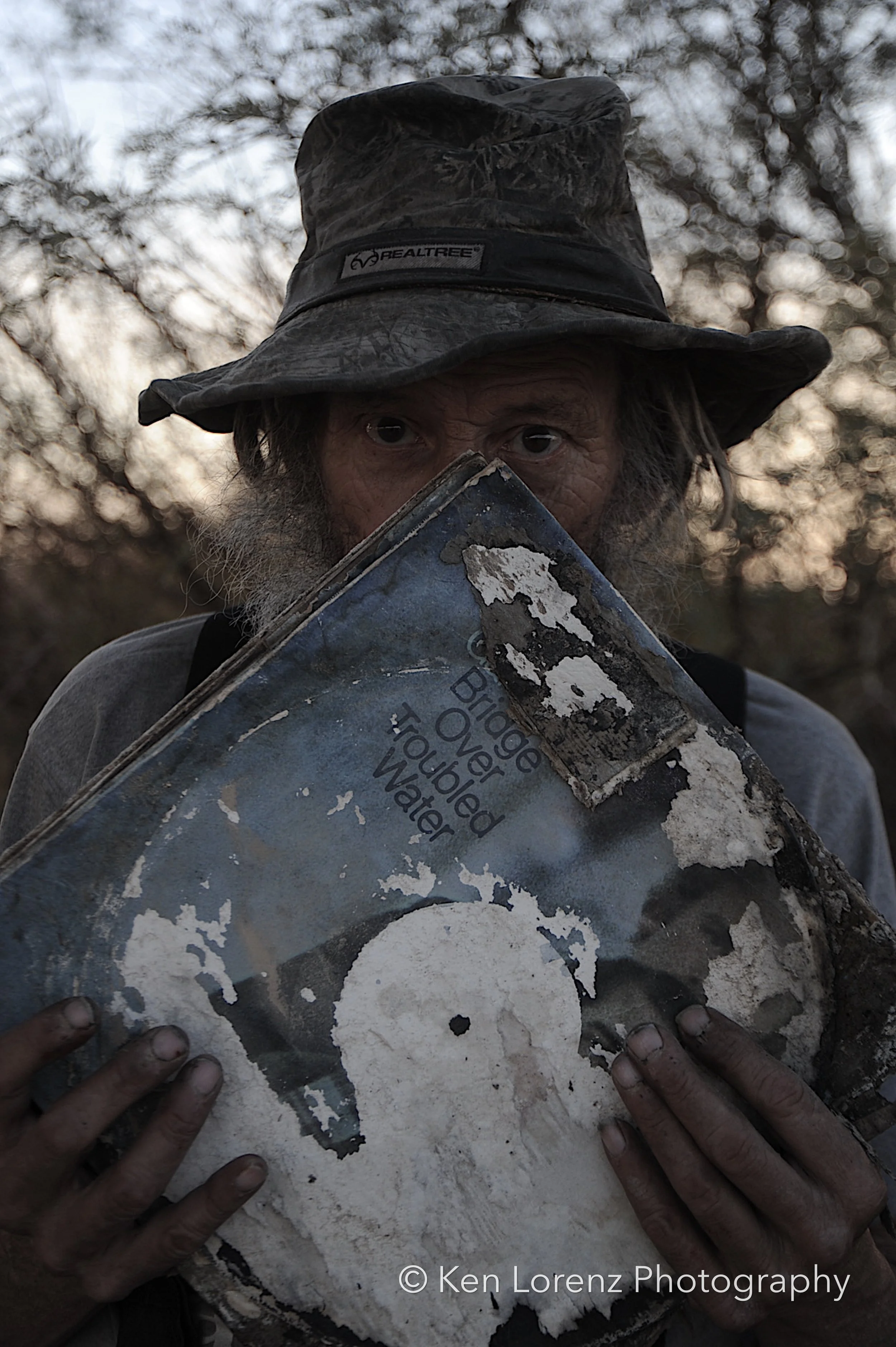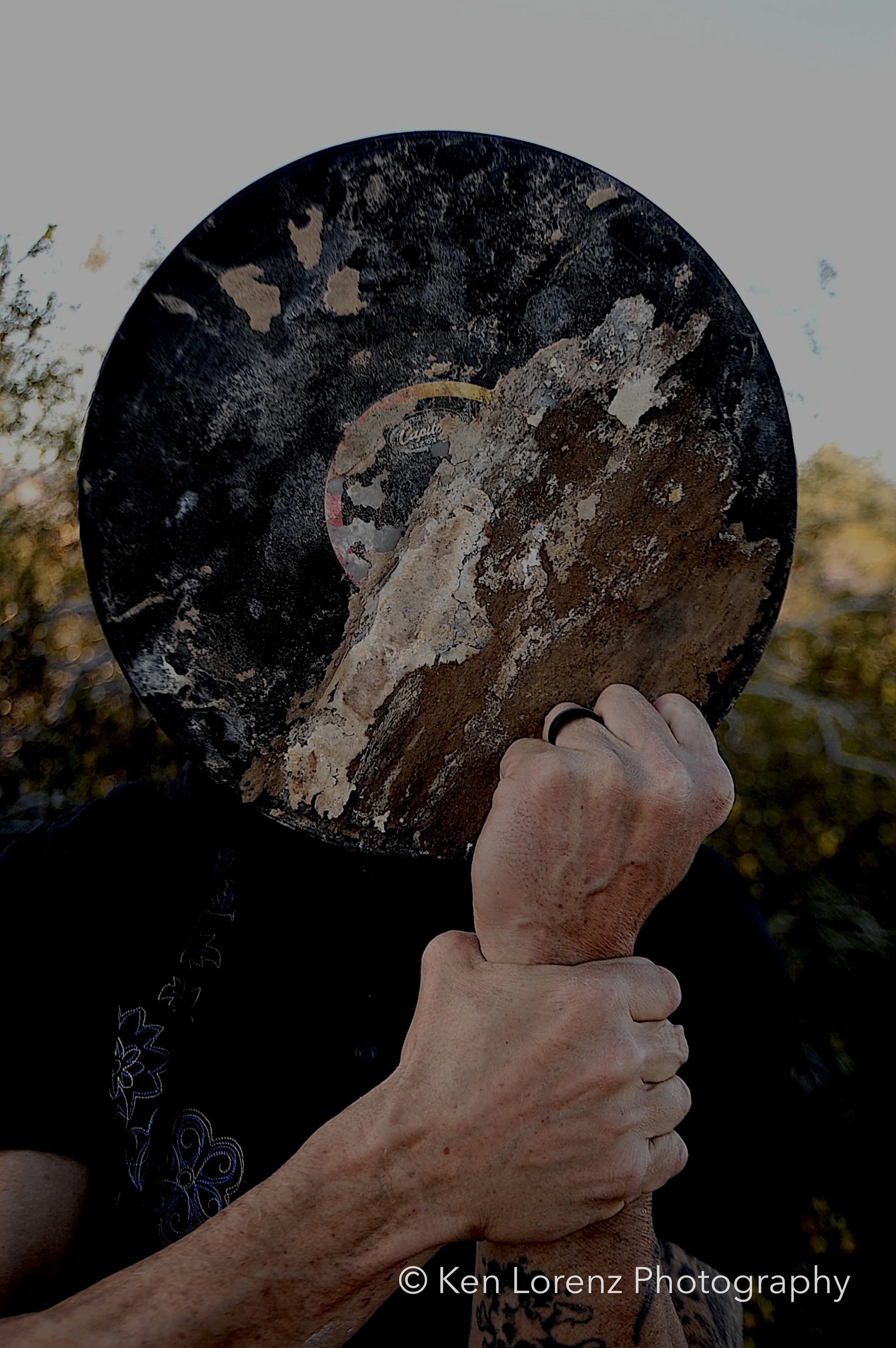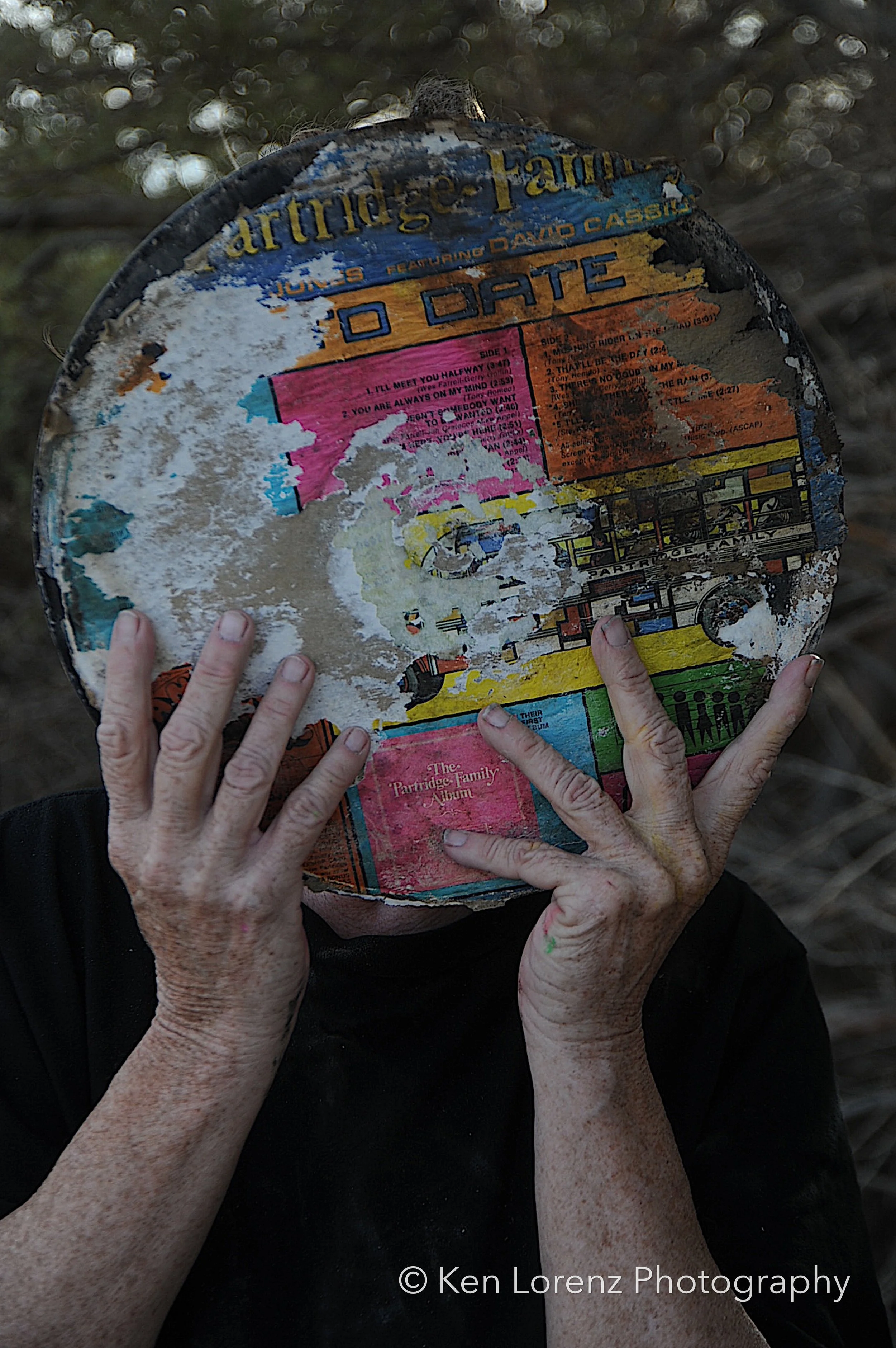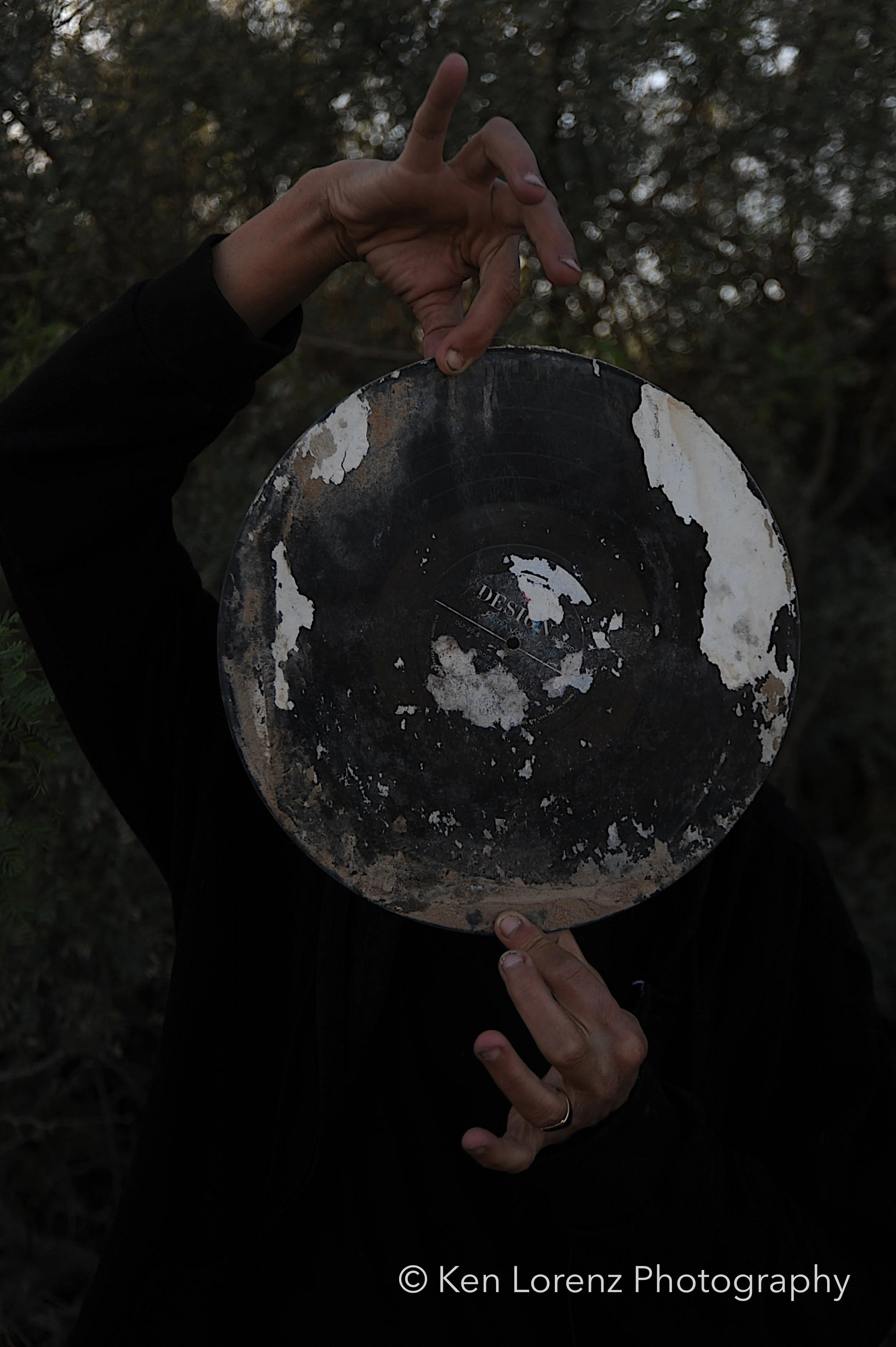 The records and their sleeves bore the marks of their environment: torn and fragmented covers, pigments drained by the desert sun, labels discolored and barely legible, grooves scarred by wind-driven sand and encroaching vegetation. These surfaces, once designed to preserve and transmit sound, now carry the visible inscription of time and entropy. In the work, these distressed LPs are reanimated as masks, worn by the “slabbers”—residents of Slab City who embody the improvisational, transient spirit of the community. Their presence situates the found objects within a living context, allowing the photographs to oscillate between documentation, portraiture, and metaphor.
