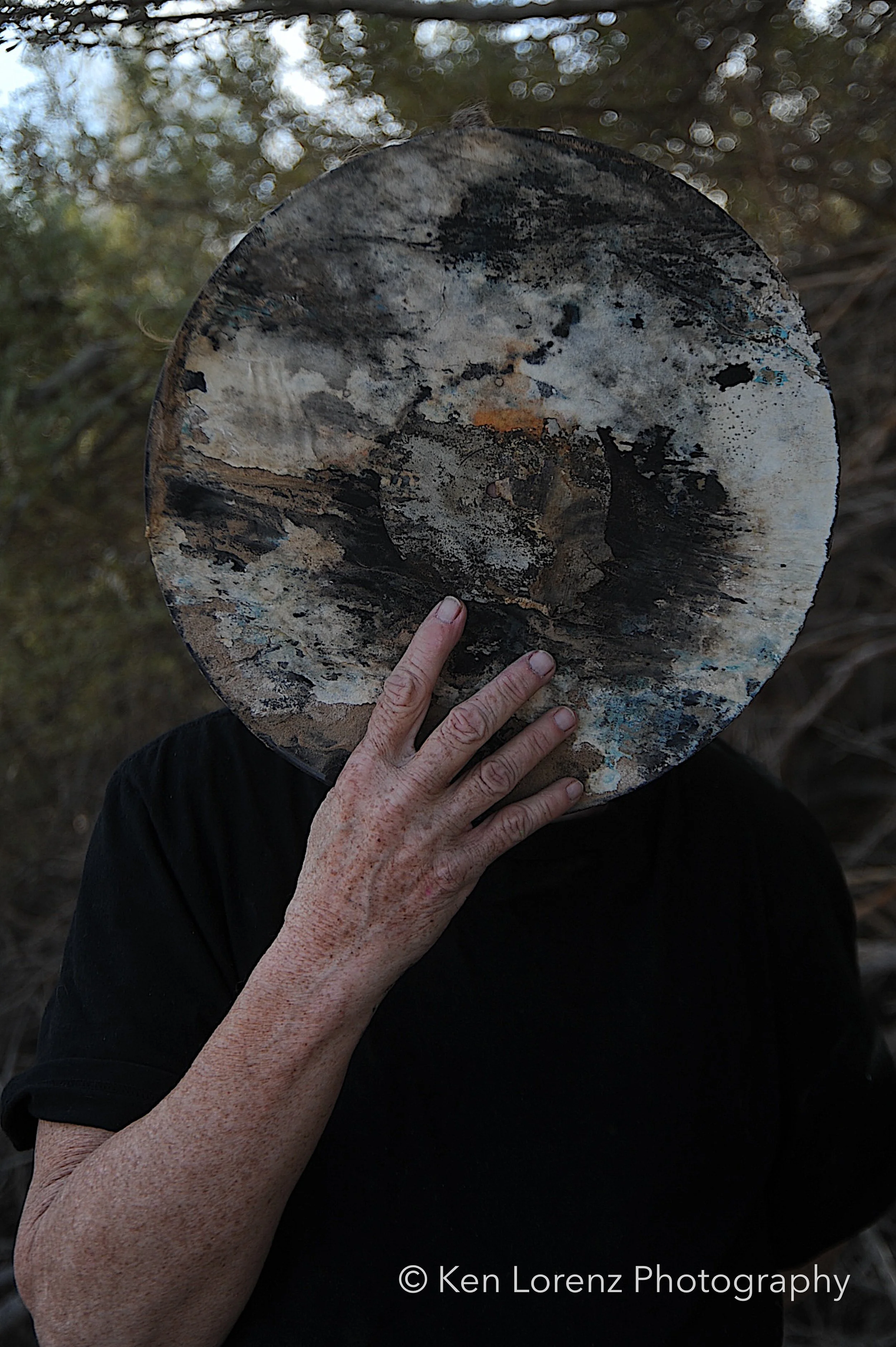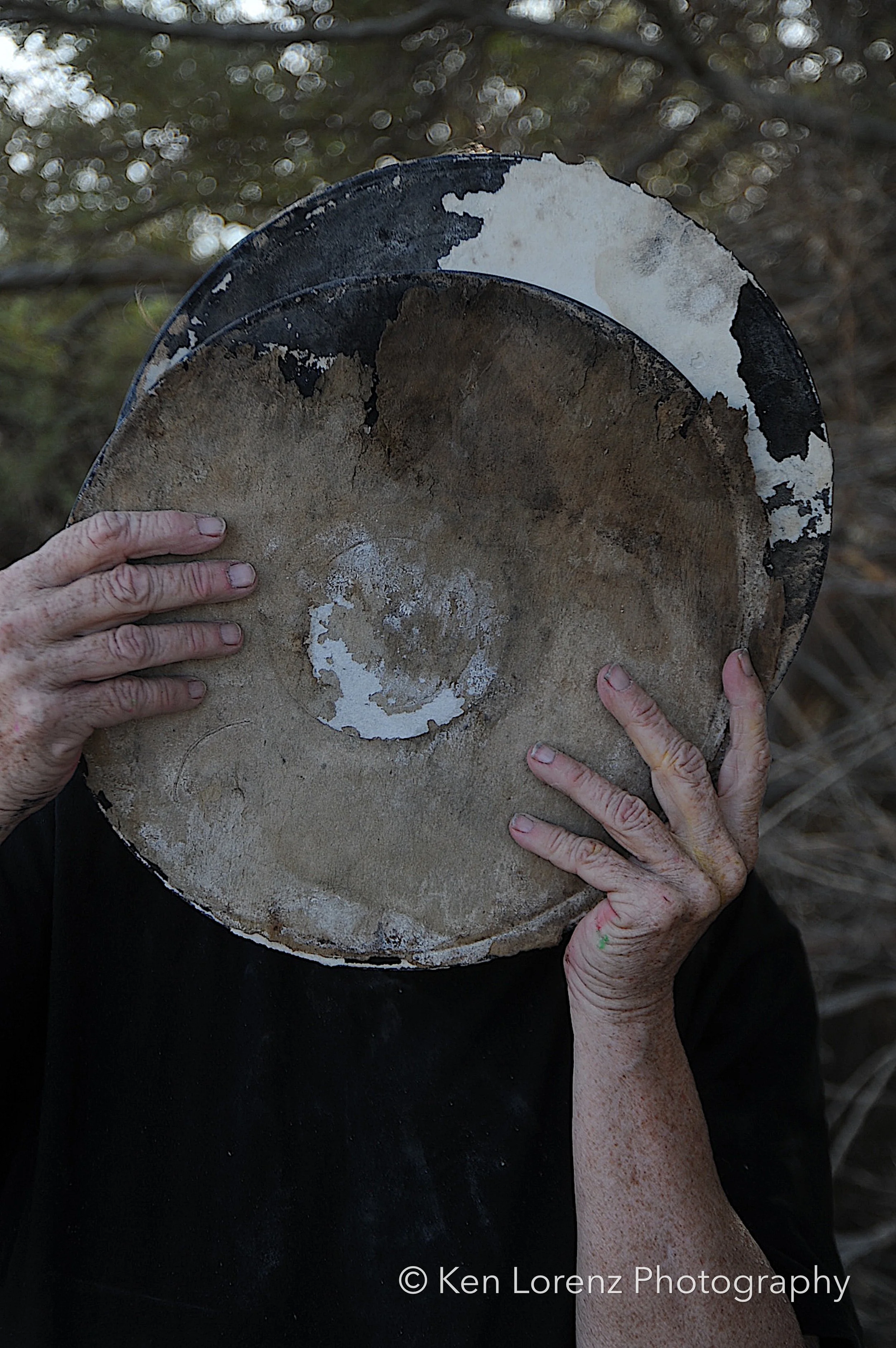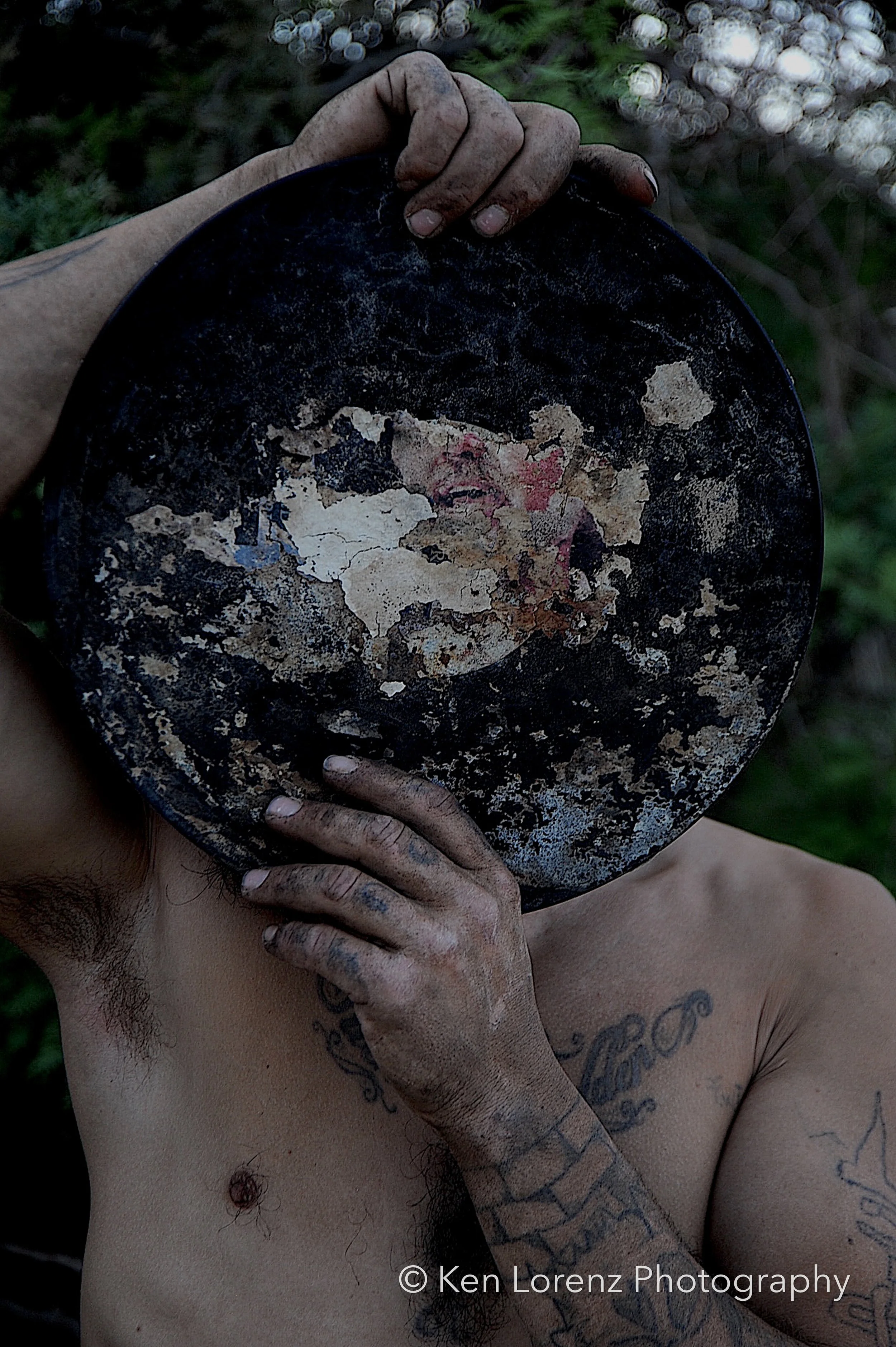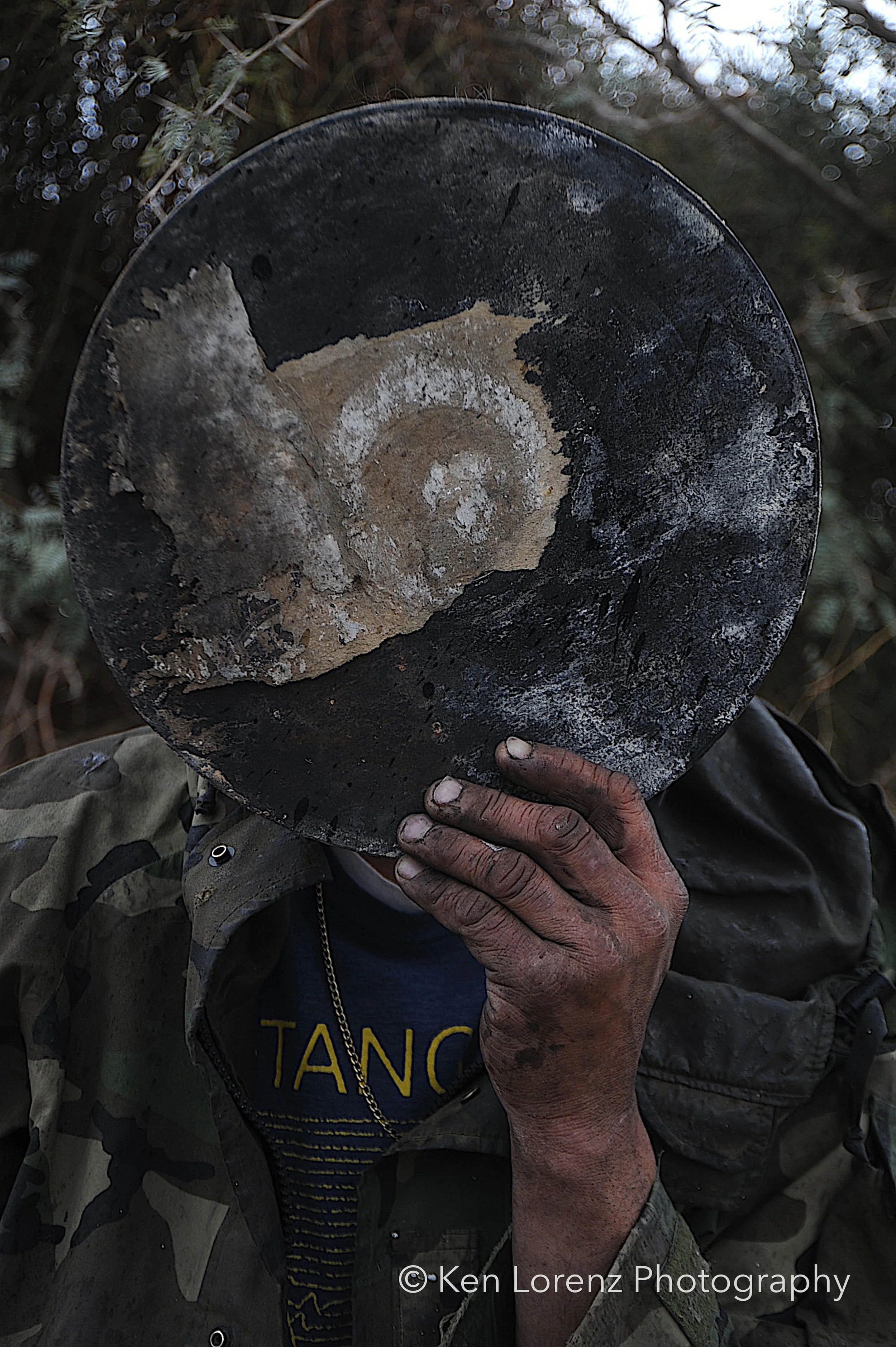The records and their sleeves bore the marks of their environment: torn and fragmented covers, pigments drained by the desert sun, labels discolored and barely legible, grooves scarred by wind-driven sand and encroaching vegetation. These surfaces, once designed to preserve and transmit sound, now carry the visible inscription of time and entropy. In the work, these distressed LPs are reanimated as masks, worn by the “slabbers”—residents of Slab City who embody the improvisational, transient spirit of the community. Their presence situates the found objects within a living context, allowing the photographs to oscillate between documentation, portraiture, and metaphor.