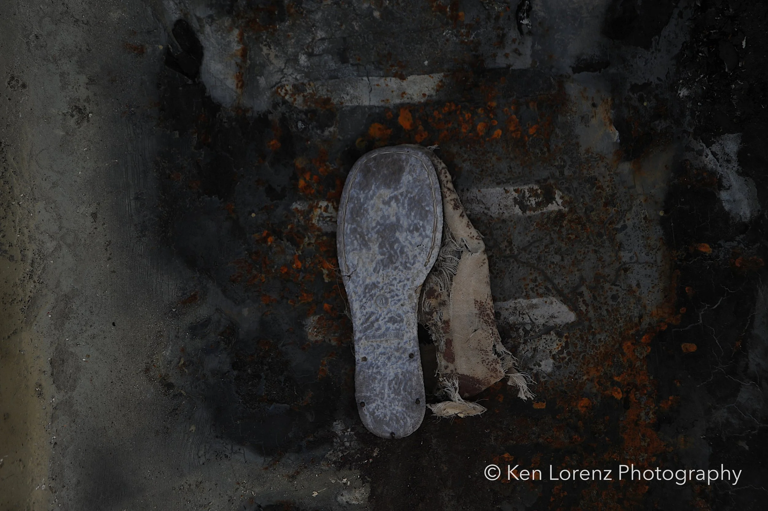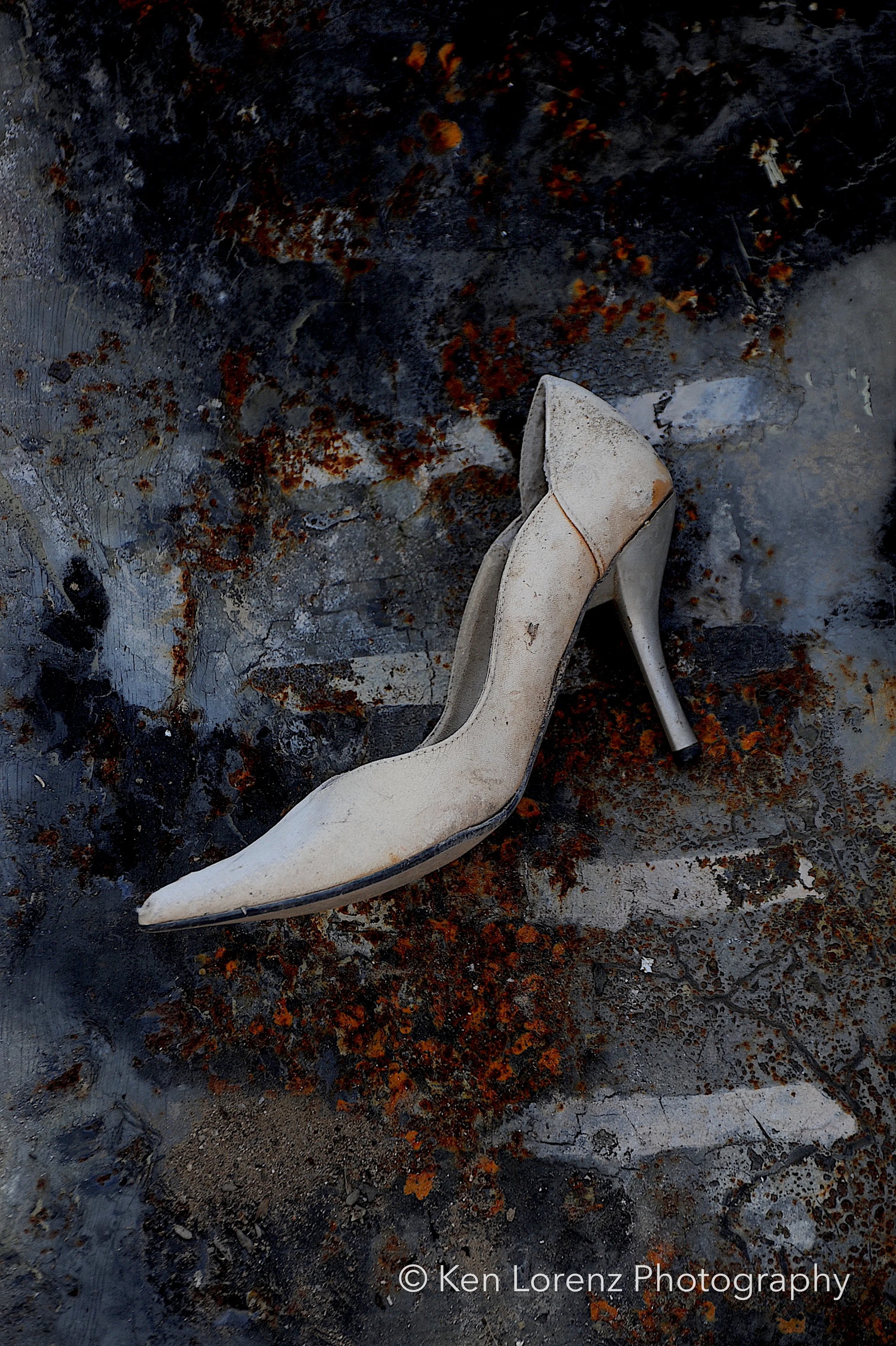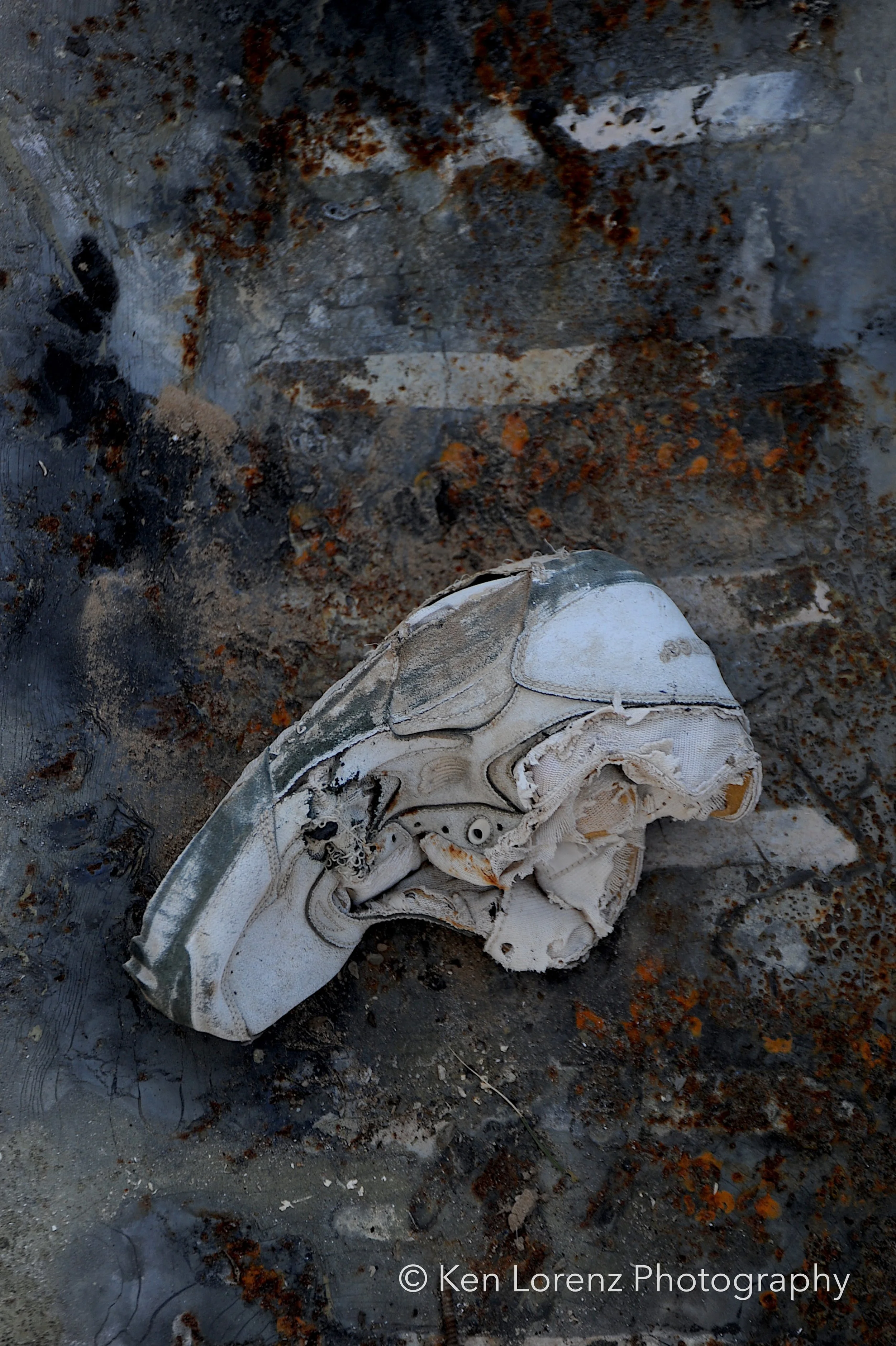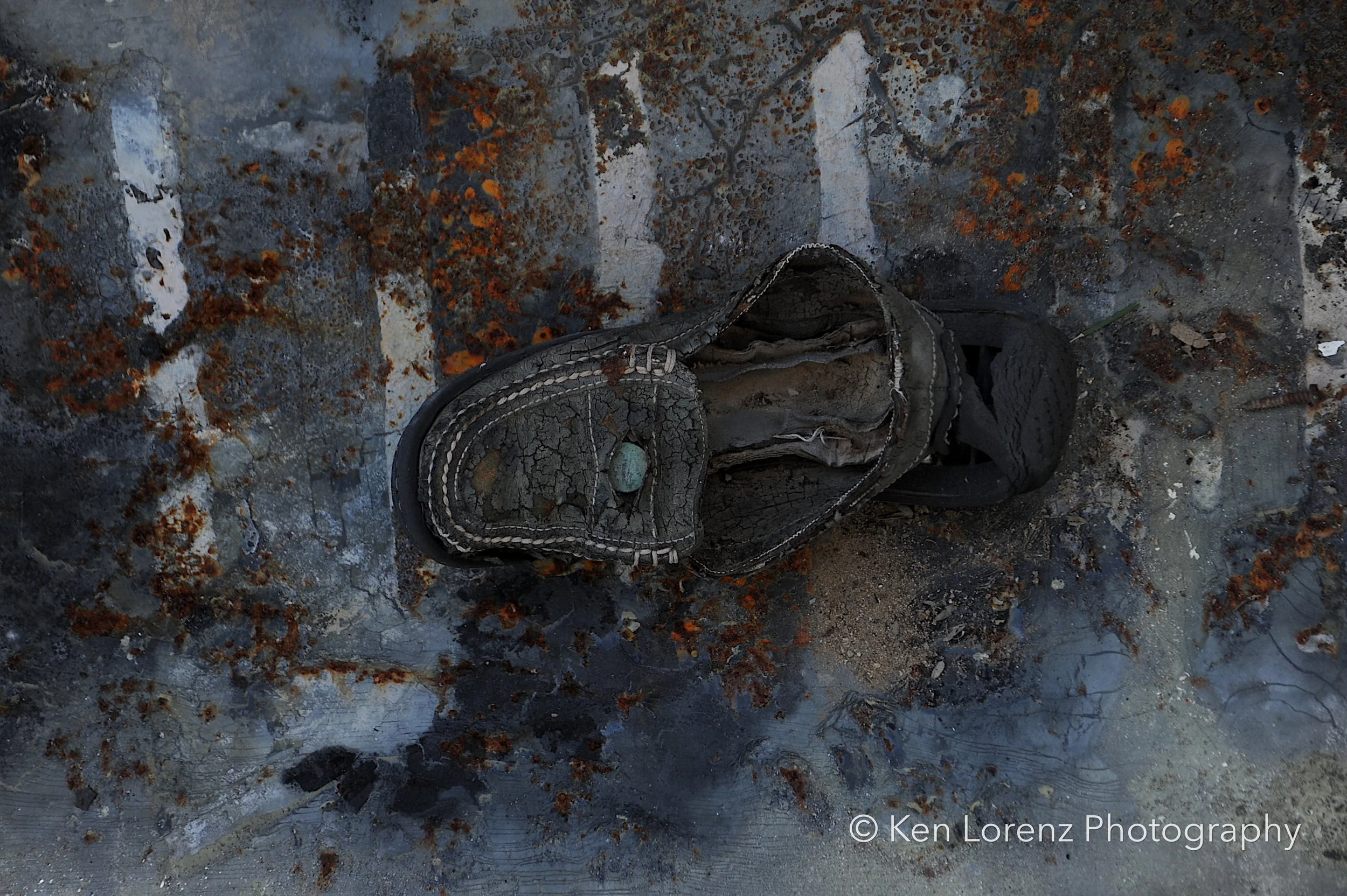 The title The Eloquent Shoe is, at its core, a paradox. It juxtaposes refinement with ruin, grace with decay. The shoes featured in this series were gathered from the desert floor in a remote area of Southern California known as “the Slab” — a place where discarded things, and often discarded people, come to rest. Once useful, perhaps even cherished, these shoes have long since outlived their original purpose. Now sun-bleached, cracked, and brittle from exposure, they bear the quiet traces of lives once in motion.