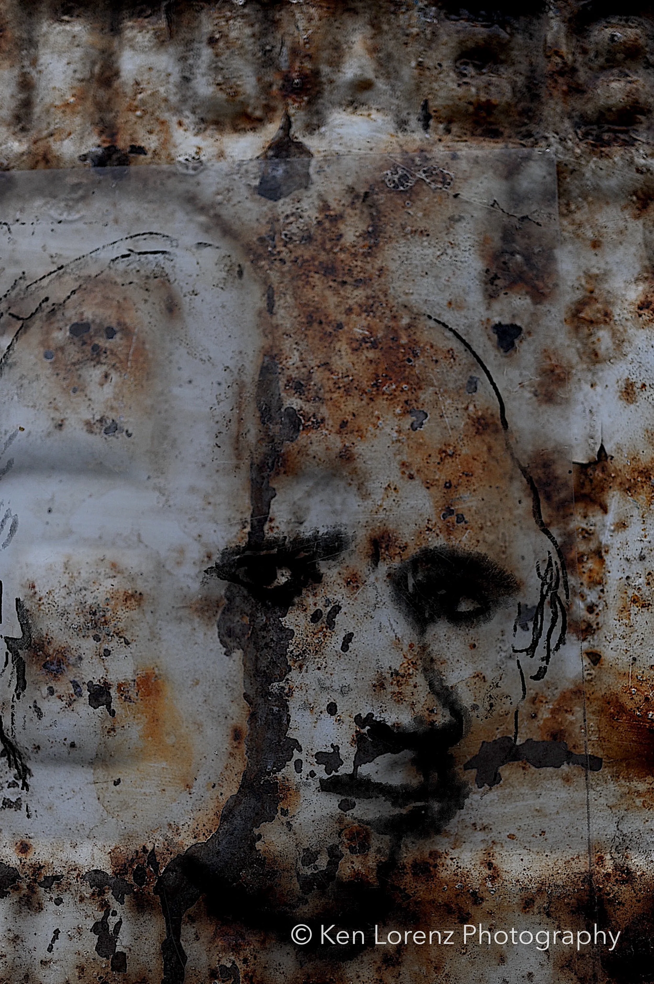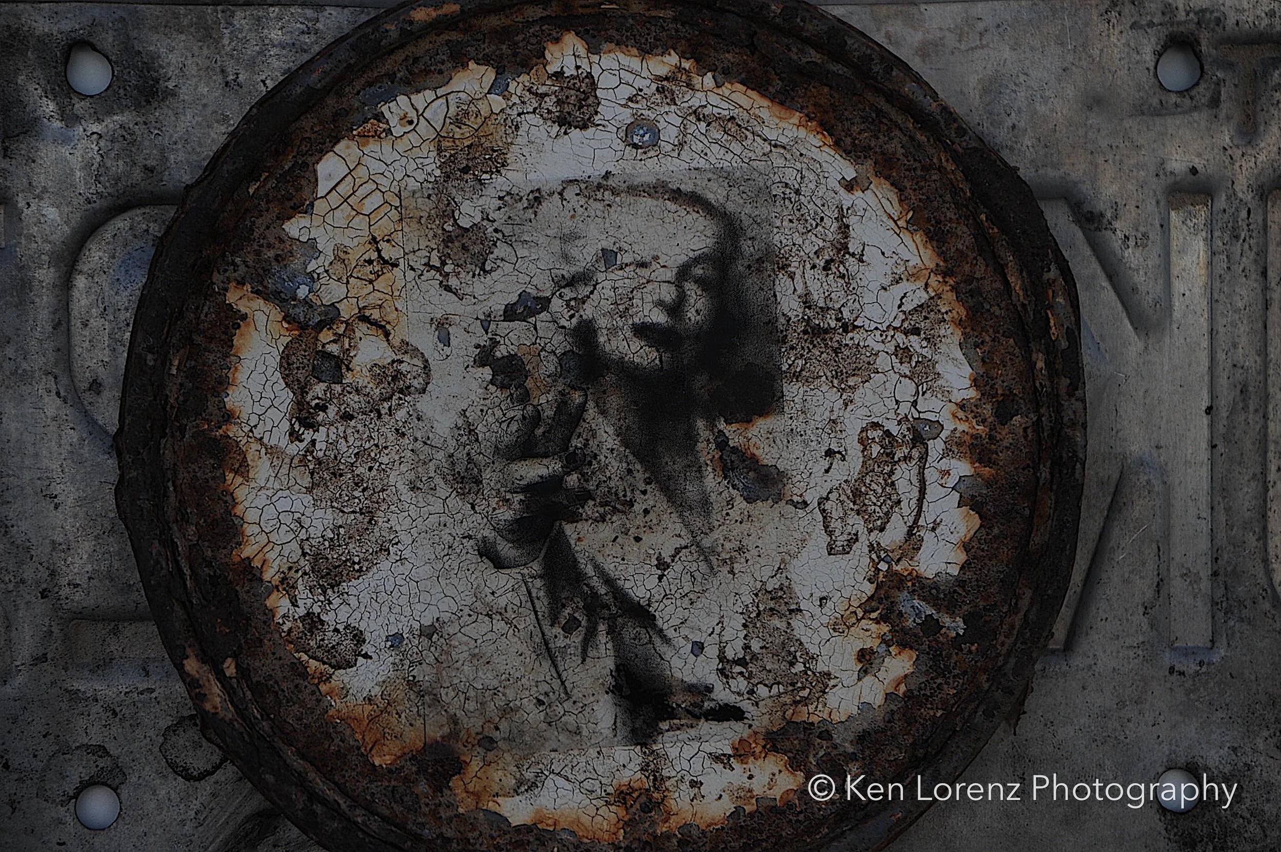 Onto these surfaces, I carefully overlay transparencies of human faces, placing each one with meticulous attention to detail before photographing the final composition. The result is a series of dreamlike, almost ghostly portraits, where identity floats atop the industrial patina of time. The juxtaposition of human fragility and metal resilience invites reflection on memory, identity, and impermanence.