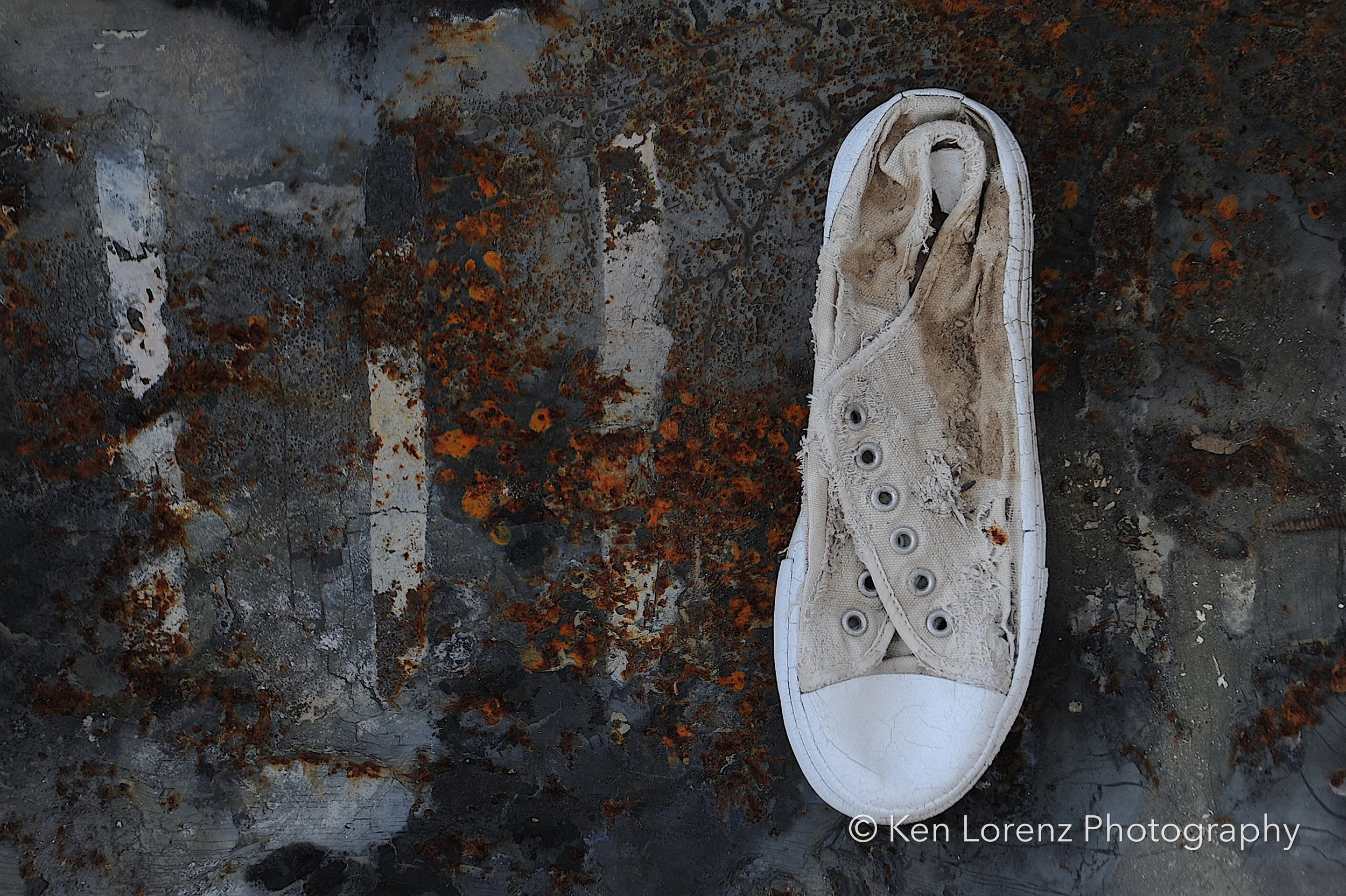 The title The Eloquent Shoe is, at its core, a paradox. It juxtaposes refinement with ruin, grace with decay. The shoes featured in this series were gathered from the desert floor in a remote area of Southern California known as “the Slab” — a place where discarded things, and often discarded people, come to rest. Once useful, perhaps even cherished, these shoes have long since outlived their original purpose. Now sun-bleached, cracked, and brittle from exposure, they bear the quiet traces of lives once in motion.